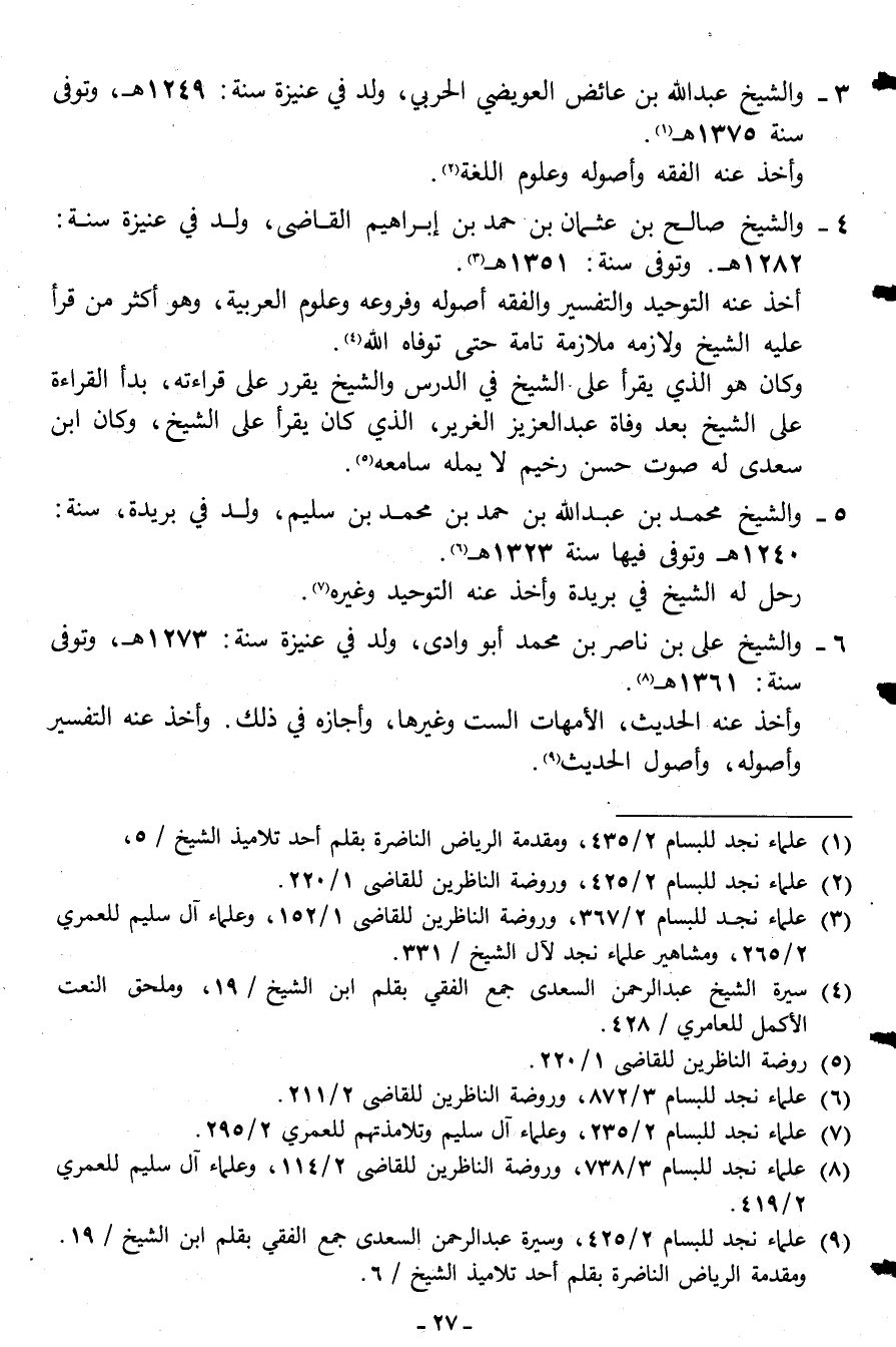9 علماء نجد للبسام 2/425، وسيرة عبد الرحمن السعدي جمع الفقي بقلم ابن الشيخ /19، ومقدمة الرياض الناضرة لأحد تلاميذ الشيخ/6.