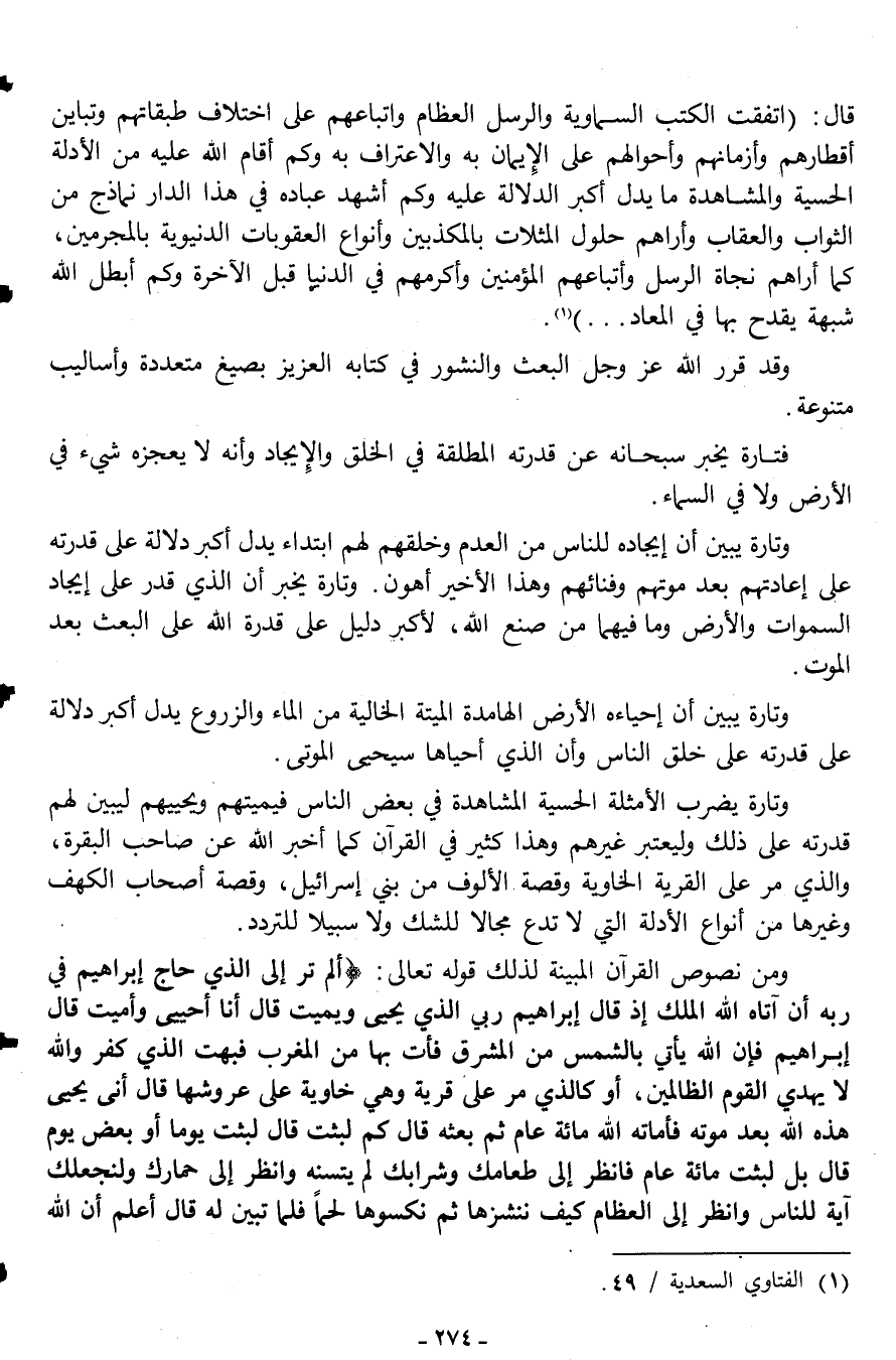 قال: "اتفقت الكتب السماوية والرسل العظام وأتباعهم على اختلاف طبقاتهم وتباين أقطارهم وأزمانهم وأحوالهم على الإيمان به والاعتراف به وكم أقام الله عليه من الأدلة الحسية والمشاهدة ما يدل أكبر الدلالة عليه وكم أشهد عباده في هذا الدار نماذج من الثواب والعقاب وأراهم حلول المثلات بالمكذبين وأنواع العقوبات الدنيوية بالمجرمين، كما أراهم نجاة الرسل وأتباعهم المؤمنين وأكرمهم في الدنيا قبل الآخرة وكم أبطل الله شبهة يقدح بها في المعاد...."1.