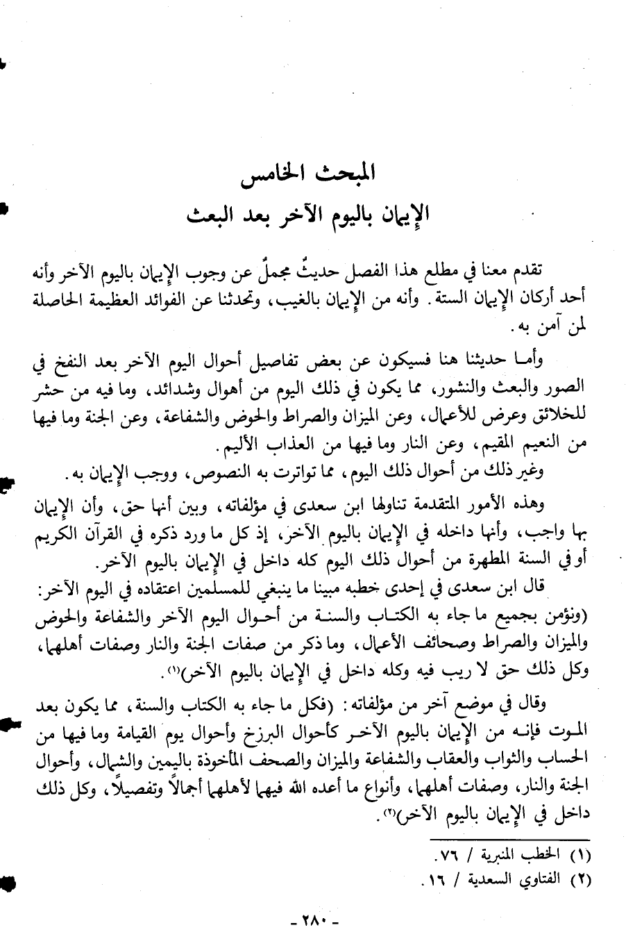 وقال في موضع آخر من مؤلفاته: "فكل ما جاء به الكتاب والسنة، مما يكون بعد الموت فإنه من الإيمان باليوم الآخر كأحوال البرزخ وأحوال يوم القيامة وما فيه من الحساب والثواب والعقاب والشفاعة والميزان والصحف المأخوذة باليمين والشمال، وأحوال الجنة والنار، وصفات أهلهما، وأنواع ما أعده الله فيهما لأهلهما إجمالاً وتفصيلاٍ، وكل ذلك داخل في الإيمان باليوم الآخر"2