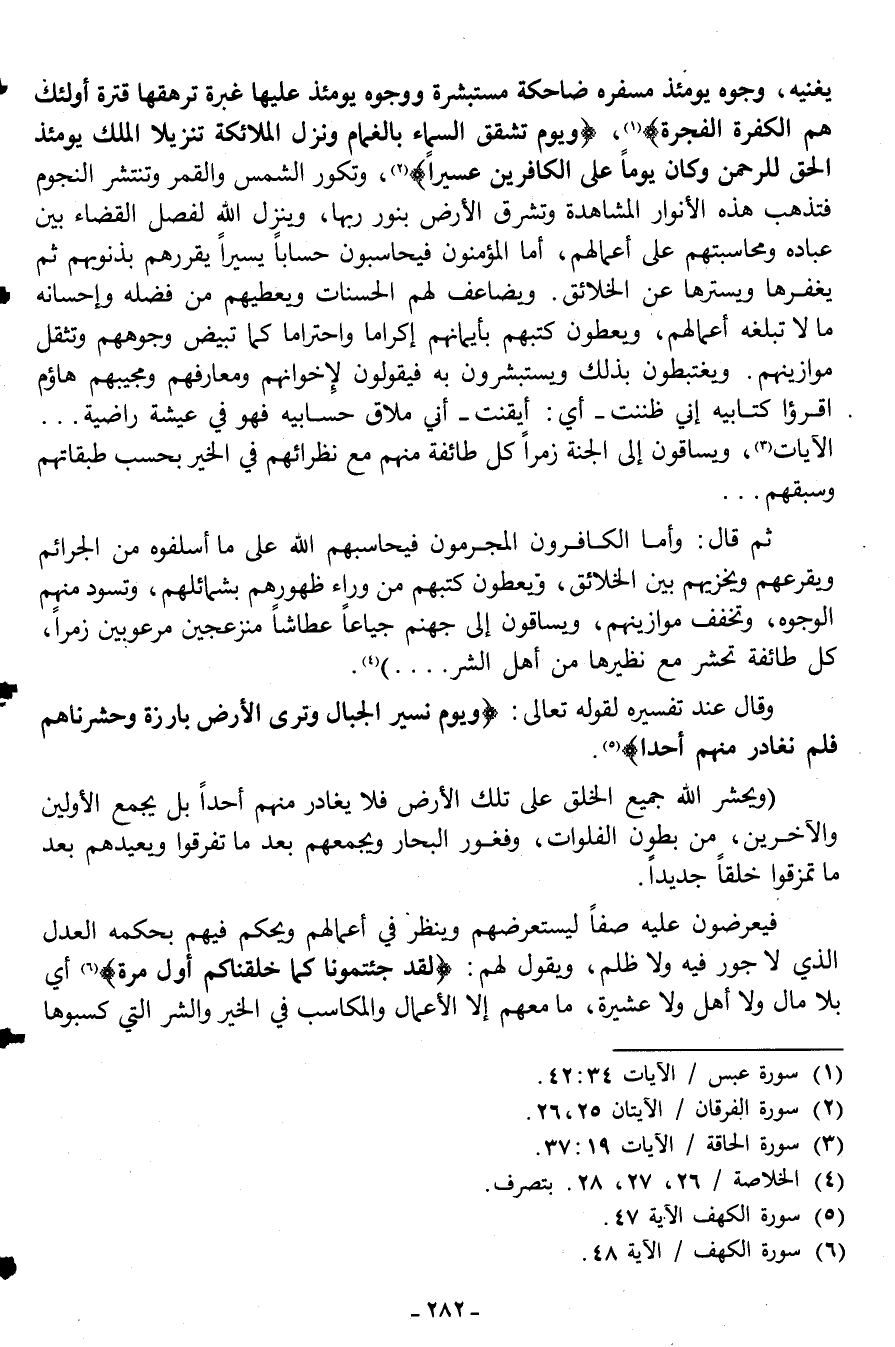 وقال عند تفسيره لقوله تعالى: {وَيَوْمَ نُسَيِّرُ الْجِبَالَ وَتَرَى الْأَرْضَ بَارِزَةً وَحَشَرْنَاهُمْ فَلَمْ نُغَادِرْ مِنْهُمْ أَحَداً} 5.