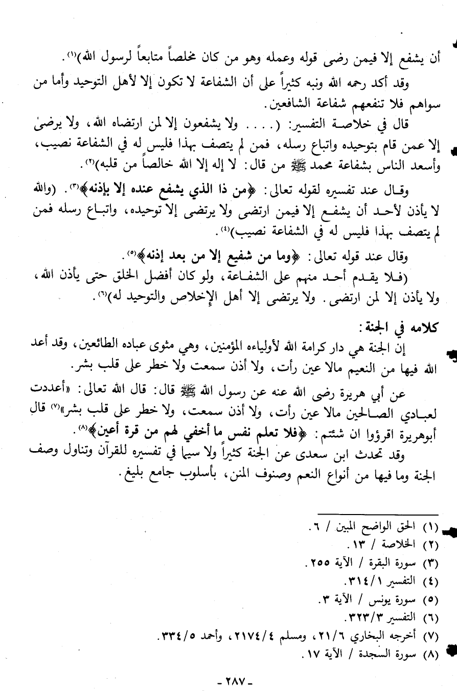 وقال عند تفسيره لقوله تعالى: {مَنْ ذَا الَّذِي يَشْفَعُ عِنْدَهُ إِلَّا بِإِذْنِهِ} 3 "والله لا يأذن لأحد أن يشفع إلا فيمن ارتضى ولا يرتضي إلا توحيده، واتباع رسله فمن لم يتصف بهذا فليس له في الشفاعة نصيب"4.