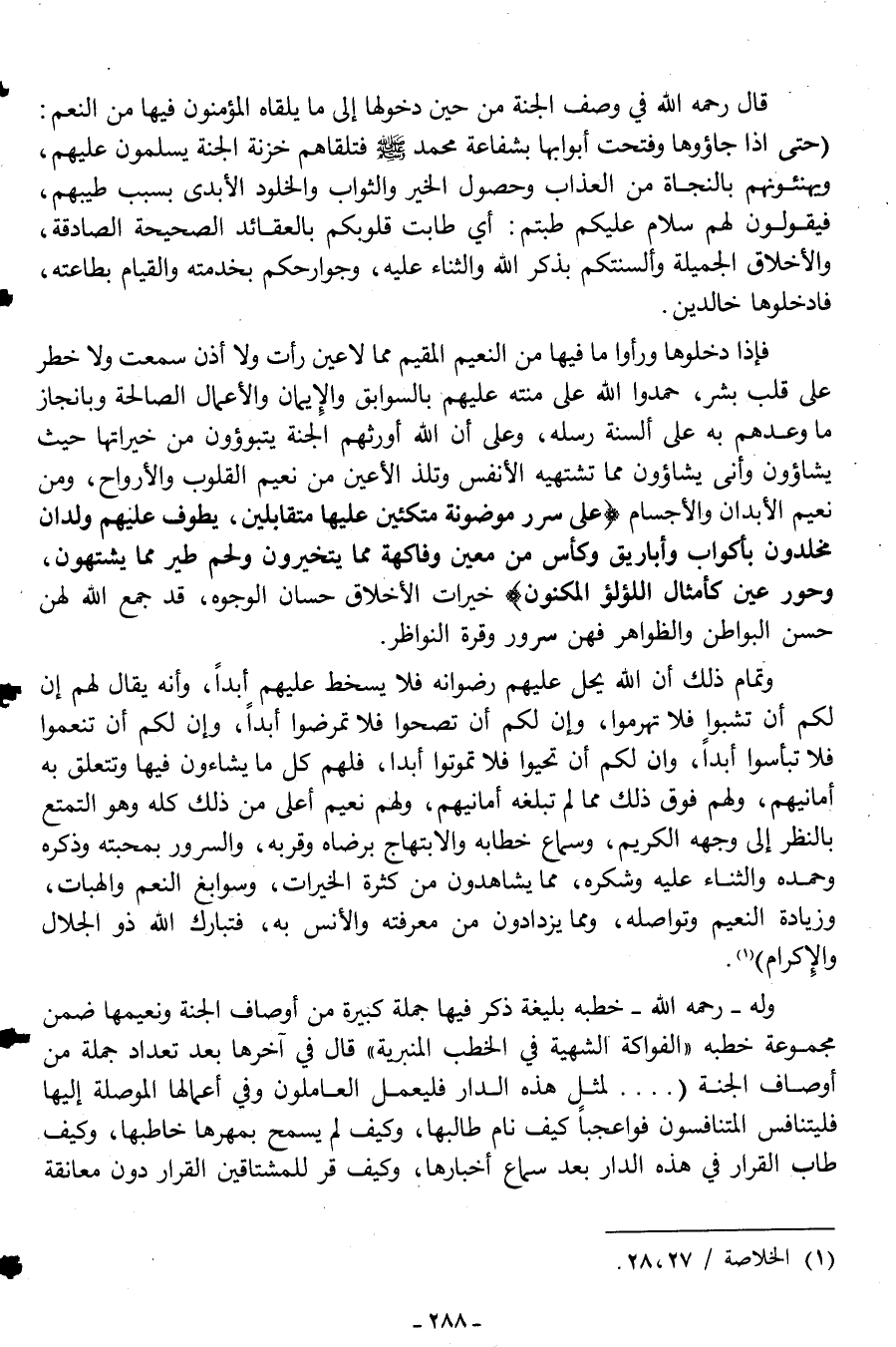 وله ـ رحمه الله ـ خطبة بليغة ذكر فيها جملة كبيرة من أوصاف الجنة ونعيمها ضمن مجموعة خطبه "الفواكه الشهية في الخطب المنبرية" قال في آخرها بعد تعداد جملة من أوصاف الجنة " ... لمثل هذه الدار فليعمل العاملون وفي أعمالها الموصلة إليها فليتنافس المتنافسون فواعجباً كيف نام طالبها، وكيف لم يسمح بمهرها خاطبها، وكيف طاب القرار في هذه الدار بعد سماع أخبارها، وكيف للمشتاقين القرار دون معانقة