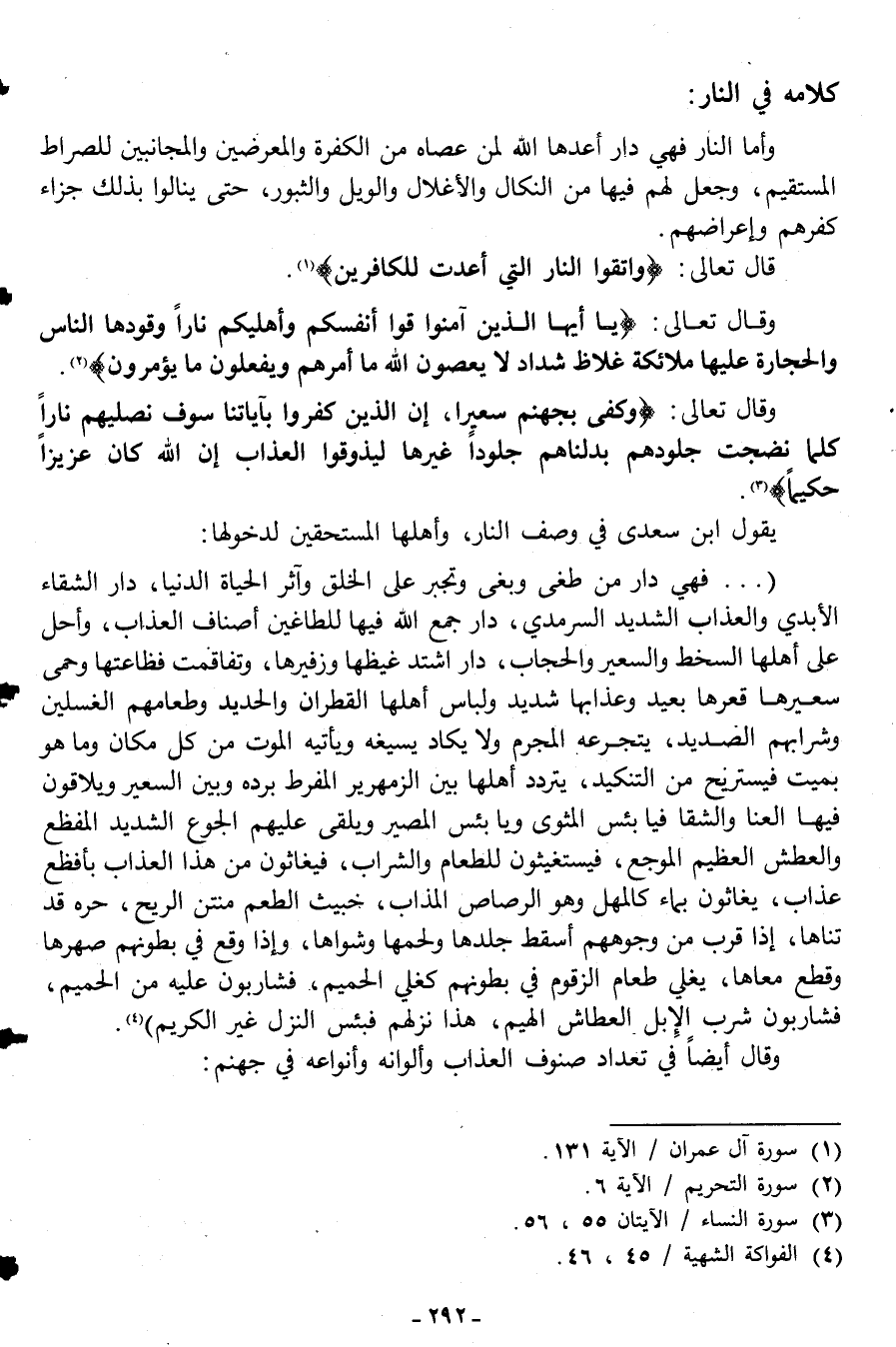 ".....فهي دار من طغى وبغى وتجبر على الخلق وآثر الحياة الدنيا، دار الشقاء الأبدي والعذاب الشديد السرمدي، دار جمع الله فيها للطاغين أصناف العذاب، وأحل على أهلها السخط والسعير والحجاب، دار اشتد غيظها وزفيرها، وتفاقمت فظاعتها وحمى سعيرها قعرها بعيد وعذابها شديد ولباس أهلها القطران والحديد وطعامهم الغسلين وشرابهم الصديد، ويتجرعه المجرم ولا يكاد يسيغه ويأتيه الموت من كل مكان وما هو بميت فيستريح من التنكيد، يتردد أهلها بين الزمهرير والمفرط برده وبين السعير ويلاقون فيها العنا والشقا فيا بئس المثوى ويا بئس المصير ويلقى عليهم الجوع الشديد المفظع والعطش العظيم الموجع، فيستغيثون للطعام والشراب، فيغاثون من هذا العذاب بأفظع عذاب، يغاثون بماء كالمهل وهو الرصاص المذاب، خبيث الطعم منتن الريح، حره قد تناها، إذا قرب من وجوههم أسقط جلدها ولحمها وشواها، وإذا وقع في بطونهم صهرها وقطع معاها، يغلي طعام الزقوم في بطونهم كغلي الحميم، فشاربون عليه من الحميم، فشاربون شرب الإبل العطاش الهيم، هذا نزلهم فبئس النزل غير الكريم"4.
