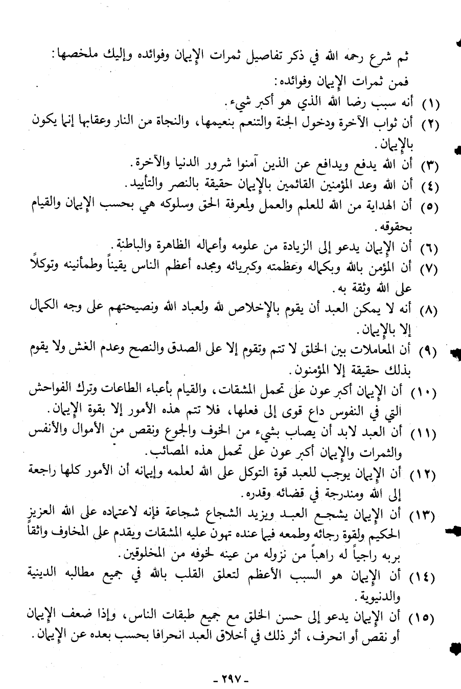 ثم شرع رحمه الله في ذكر تفاصيل ثمرات الإيمان وفوائده وإليك ملخصها: