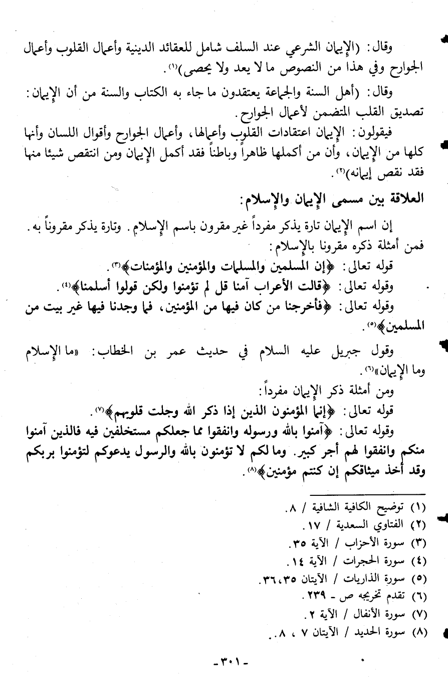 وقال: "الإيمان الشرعي عند السلف شامل للعقائد الدينية وأعمال القلوب وأعمال الجوارح وفي هذا من النصوص ما لا يعد ولا يحصى"1.