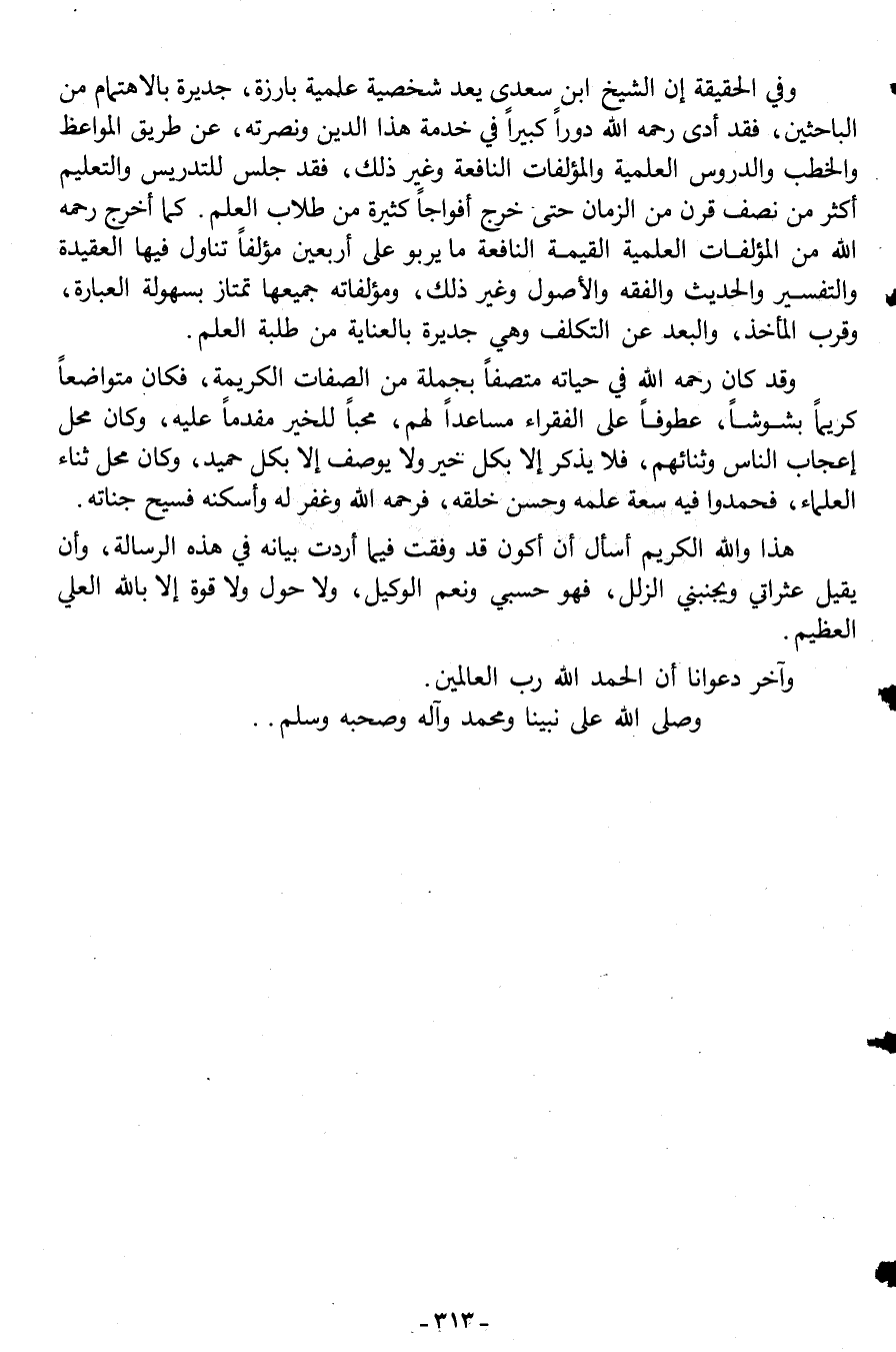 وفي الحقيقة إن الشيخ ابن سعدي يعد شخصية علمية بارزة، جديرة بالاهتمام من الباحثين، فقد أدى رحمه الله دوراً كبيراً في خدمة هذا الدين ونصرته، عن طريق المواعظ والخطب والدروس العلمية والمؤلفات النافعة وغير ذلك، فقد جلس للتدريس والتعليم أكثر من المؤلفات العلمية القيمة النافعة ما يربو على أربعين مؤلفاً تناول فيها العقيدة والتفسير والحديث والفقه والأصول وغير ذلك، ومؤلفاته جميعها تمتاز بسهولة العبارة، وقرب المأخذ، والبعد عن التكليف وهي جديرة بالعناية من طلبة العلم.