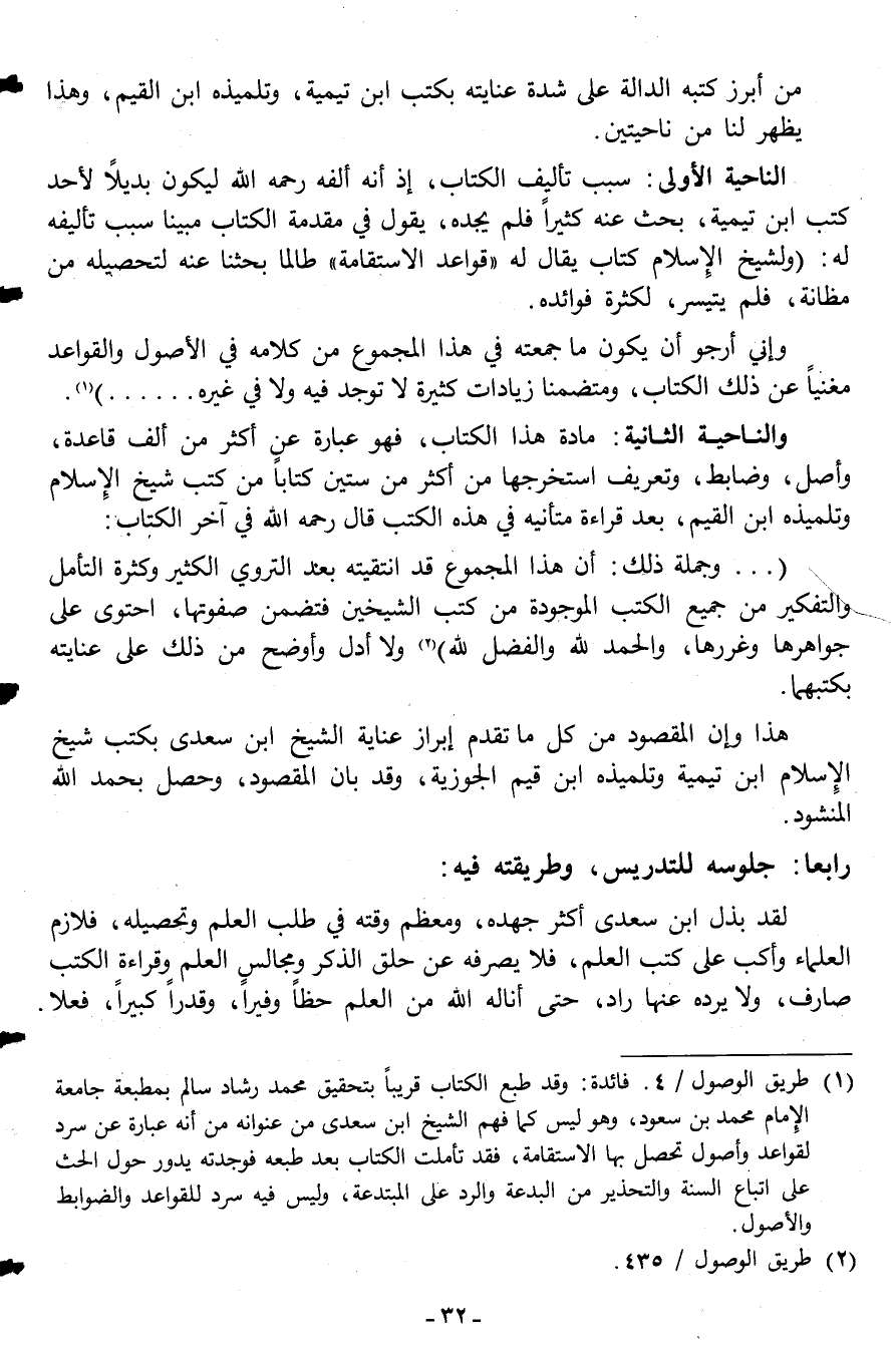1 طريق الوصول/4. فائدة: وقد طبع الكتاب قريباً بتحقيق محمد رشاد سالم بمطبعة جامعة الإمام محمد بن سعود، وهو ليس كما فهم الشيخ ابن سعدي من عنوانه من أنه عبارة عن سرد لقواعد وأصول تحصل بها الاستقامة، فقد تأملت الكتاب بعد طبعه فوجدته يدور حول الحث على اتباع السنة والتحذير من البدعة والرد على المبتدعة، وليس فيه سرد للقواعد والضوابط والأصول.