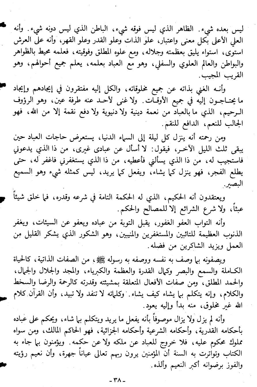 وأنه لم يزل ولا يزال موصوفا بأنه يفعل ما يريد ويتكلم بما شاء، ويحكم على عباده بأحكامه القدرية، وأحكامه الشرعية وأحكامه الجزائية، فهو الحاكم المالك، ومن سواه مملوك محكوم عليه، فلا خروج للعباد عن ملكه ولا عن حكمه. يؤمنون بما جاء به الكتاب وتواترت به السنة أن المؤمنين يرون ربهم تعالى عيانا جهرة، وأن نعيم رؤيته والفوز برضوانه أكبر النعيم وألذه.