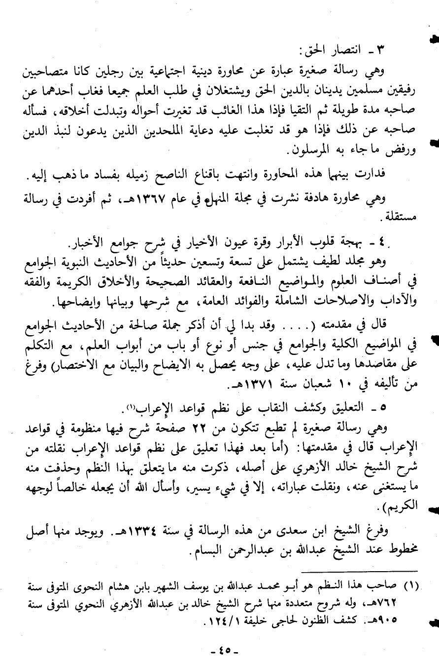 وهو مجلد لطيف يشتمل على تسعة وتسعين حديثاً من الأحاديث النبوية الجوامع في أصناف العلوم والمواضيع النافعة والعقائد الصحيحة والأخلاق الكريمة والفقه والآداب والإصلاحات الشاملة والفوائد العامة، مع شرحها وبيانها وإيضاحها.