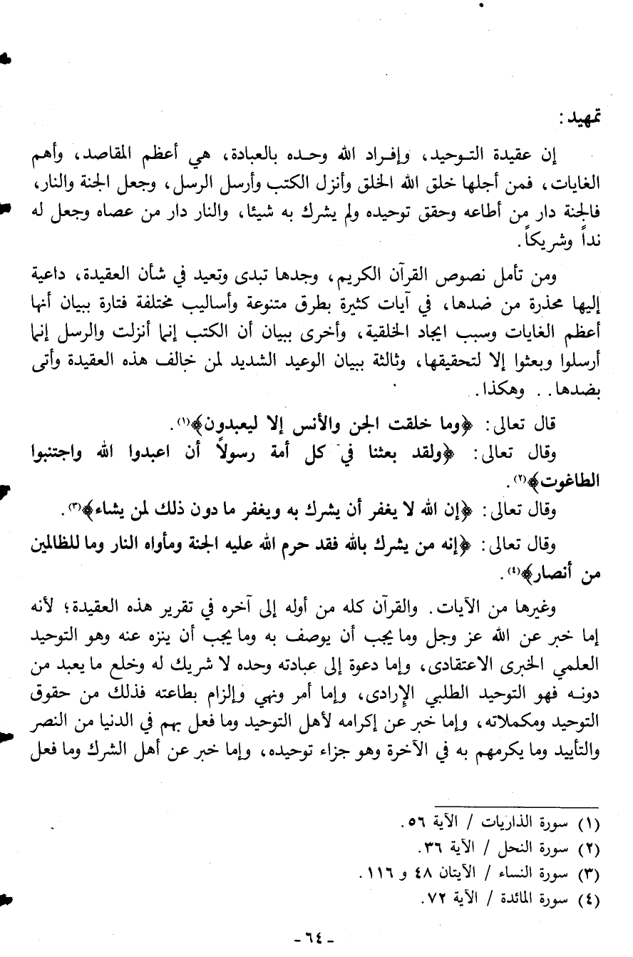 وغيرها من الآيات. والقرآن كله من أوله إلى آخره في تقرير هذه العقيدة؛ لأنه إما خبر عن الله عز وجل وما يجب أن يوصف به وما يجب أن ينزه عنه وهو التوحيد العلمي الخبري الاعتقادي، وإما دعوة إلى عبادته وحده لا شريك له وخلع ما يعبد من دونه فهو التوحيد الطلبي الإرادي، وإما أمر ونهي وإلزام بطاعته فذلك من حقوق التوحيد ومكملاته، وإما خبر عن إكرامه لأهل التوحيد وما فعل بهم في الدنيا من النصر والتأييد وما يكرمهم به في الآخرة وهو جزاء توحيده، وإما خبر عن أهل الشرك وما فعل