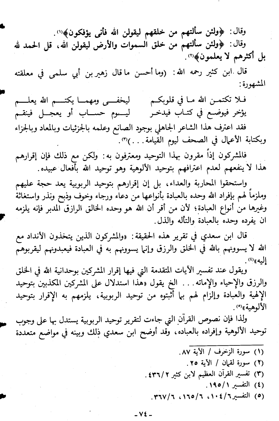 ويقول عند تفسير الآيات المتقدمة التي فيه إقرار المشركين بوحدانية الله في الخلق والرزق والإحياء والإماتة..الخ يقول: "هذا استدلال على المشركين المكذبين بتوحيد الإلهية والعبادة وإلزام لهم بما أثبتوه من توحيد الربوبية، يلزمهم به الإقرار بتوحيد الألوهية"5.