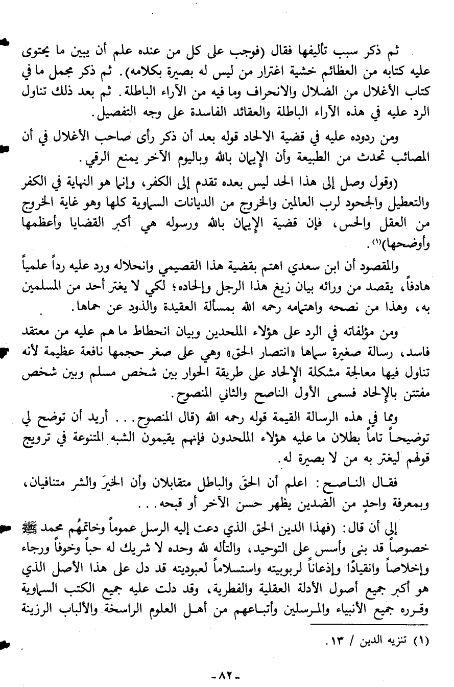 ومما في هذه الرسالة القيمة قوله رحمه الله "قال المنصوح ... أريد أن توضح لي توضيحاً تاماً بطلان ما عليه هؤلاء الملحدون فإنهم يقيمون الشبه المتنوعة في ترويج قولهم ليغتر به من لا بصيرة له.