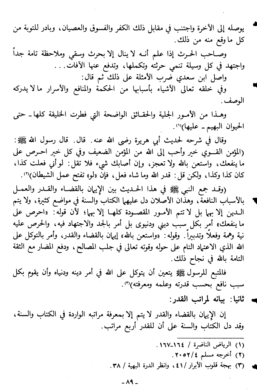 وقال في شرحه لحديث أبي هريرة رضي الله عنه، قال: رسول الله صلى الله عليه وسلم: "المؤمن القوي خير وأحب إلى الله من المؤمن الضعيف وفي كل خير احرص على ما ينفعك، واستعن بالله ولا تعجز، وإن أصابك شيء فلا تقل: لو أني فعلت كذا، كان كذا وكذا، ولكن قل: قدر الله وما شاء فعل، فإن "لو" تفتح عمل الشيطان"2.