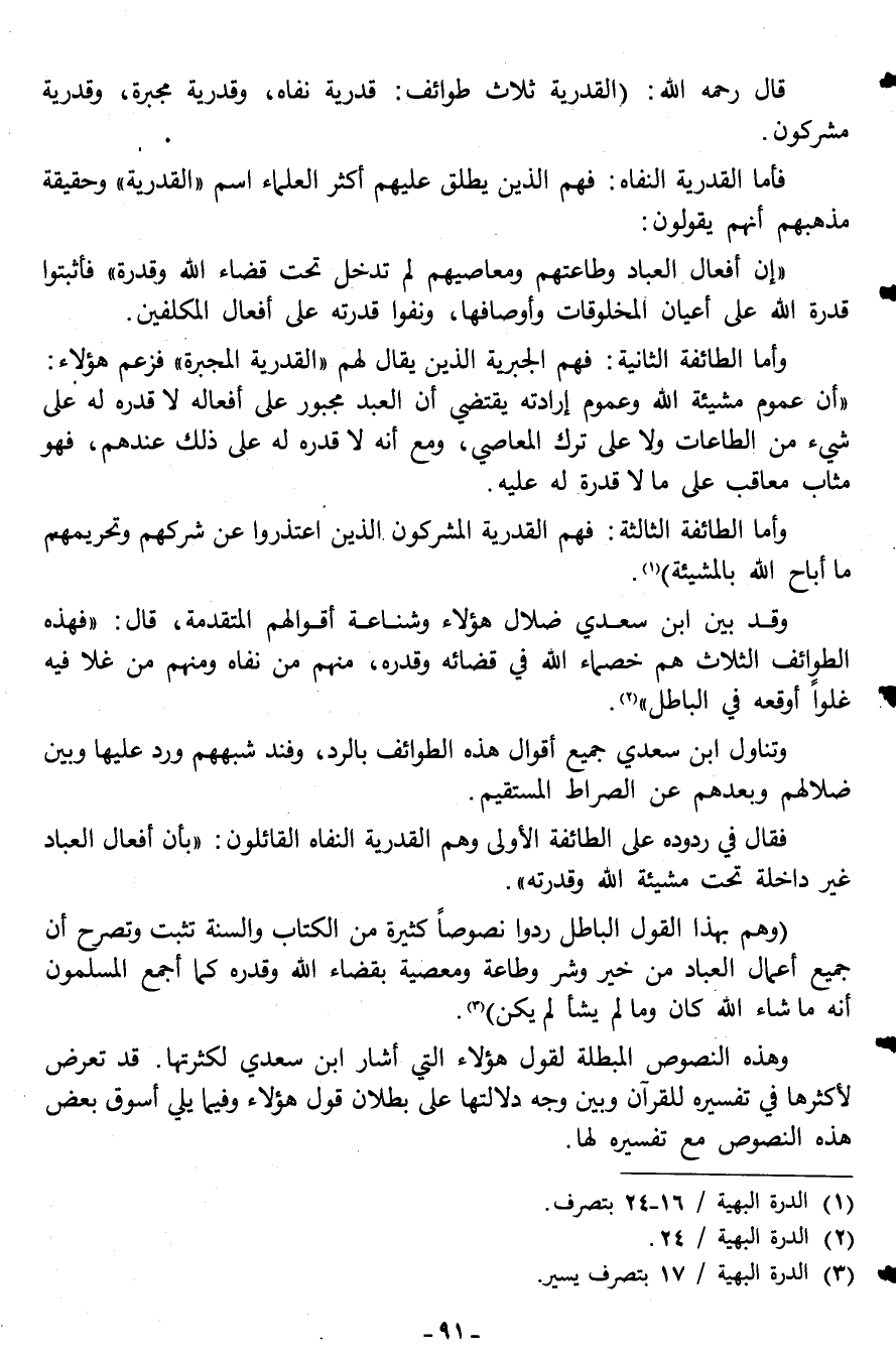 قال رحمه الله: "القدرية ثلاث طوائف: قدرية نفاه، وقدرية مجبرة، وقدرية مشركون.