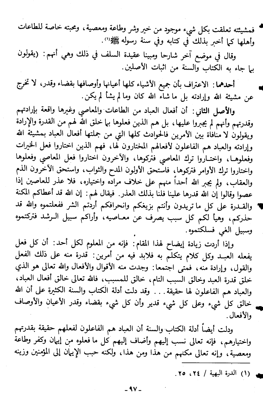 وقال في موضع آخر شارحا مبيناً عقيدة السلف في ذلك وهي أنهم: "يقولون بما جاء به الكتاب والسنة من إثبات الأصلين:
