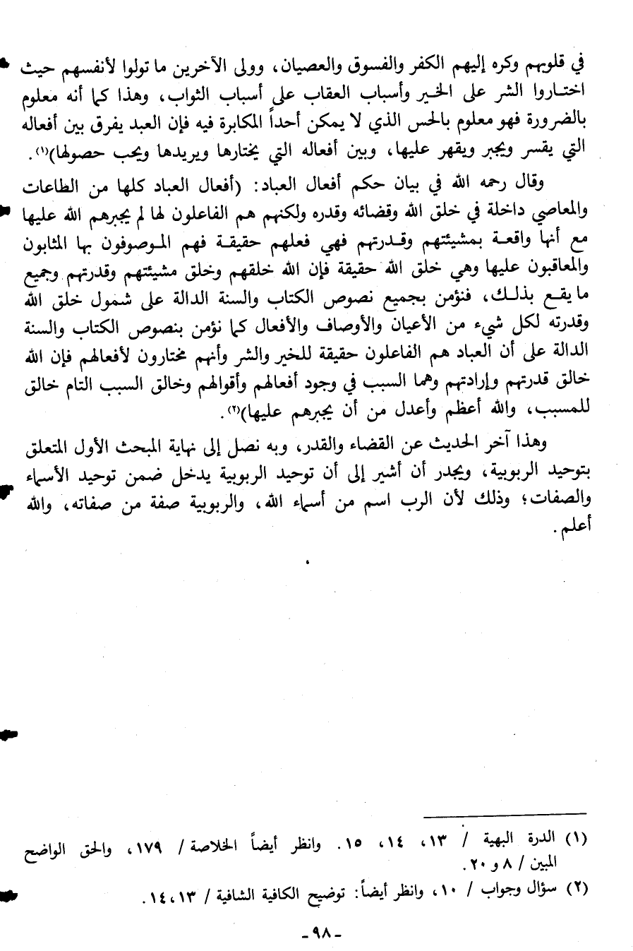وقال رحمه الله في بيان أفعال العباد: "أفعال العباد كلها من الطاعات والمعاصي داخلة في خلق الله وقضائه وقدره ولكنهم هم الفاعلون لها لم يجبرهم الله عليها مع أنها واقعة بمشيئتهم وقدرتهم فهي فعلهم حقيقة فهم الموصوفون بها المثابون والمعاقبون عليها وهي خلق الله حقيقة فإن الله خلقهم وخلق مشيئتهم وقدرتهم وجميع ما يقع بذلك، فنؤمن بجميع نصوص الكتاب والسنة الدالة على شمول خلق الله وقدرته لكل شيء من الأعيان والأوصاف والأفعال كما نؤمن بنصوص الكتاب والسنة الدالة على أن العباد هم الفاعلون حقيقة للخير والشر وأنهم مختارون لأفعالهم فإن الله خالق قدرتهم وإرادتهم وهما السبب في وجود أفعالهم وأقوالهم وخالق السبب التام خالق للمسبب، والله أعظم وأعدل من أن يجبرهم عليها"2.