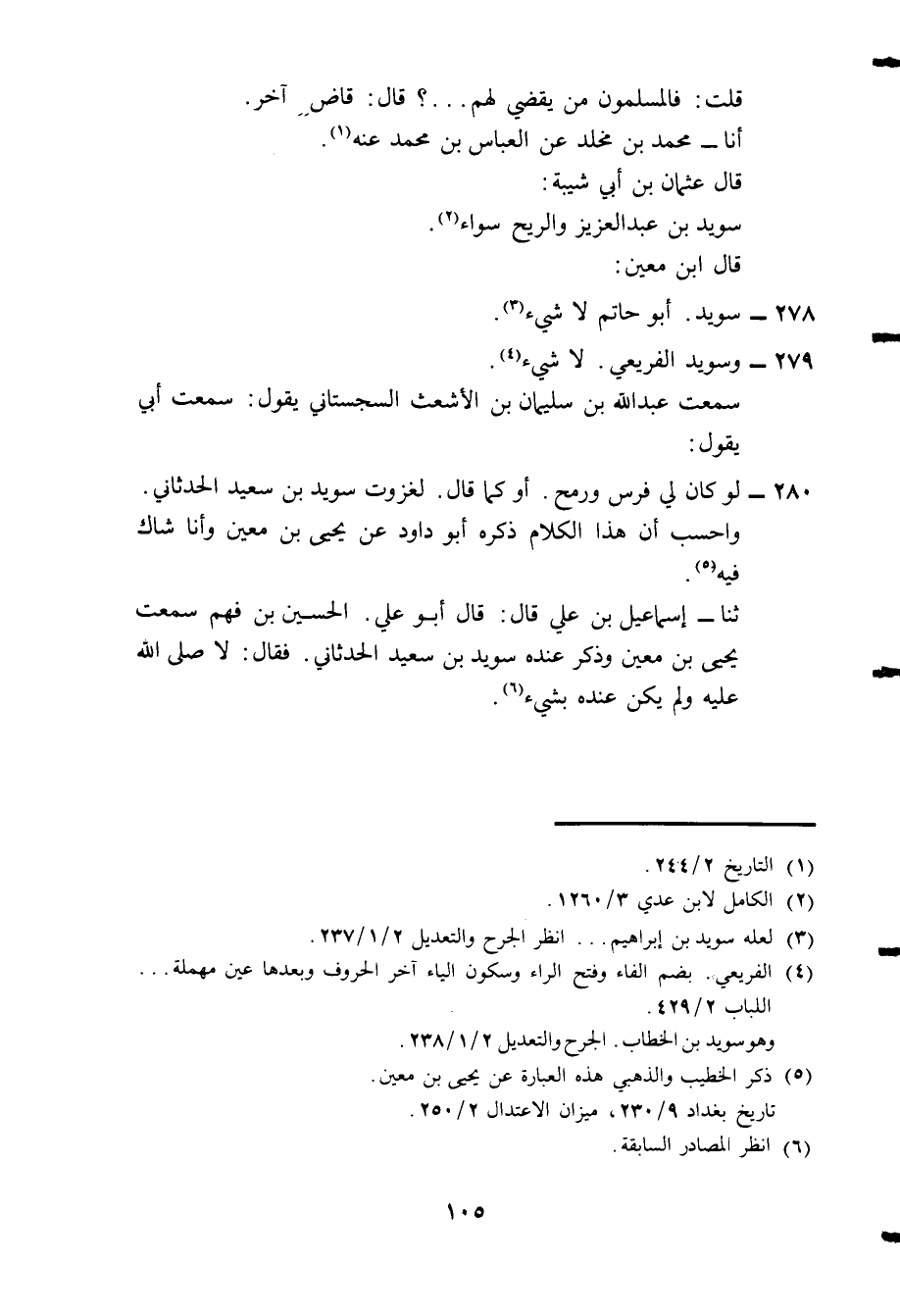 280- لو كان لي فرس ورمح. أو كما قال. لغزوت سويد بن سعيد الحدثاني. واحسب أن هذا الكلام ذكره أبو داود عن يحيي بن معين وأنا شاك فيه5.