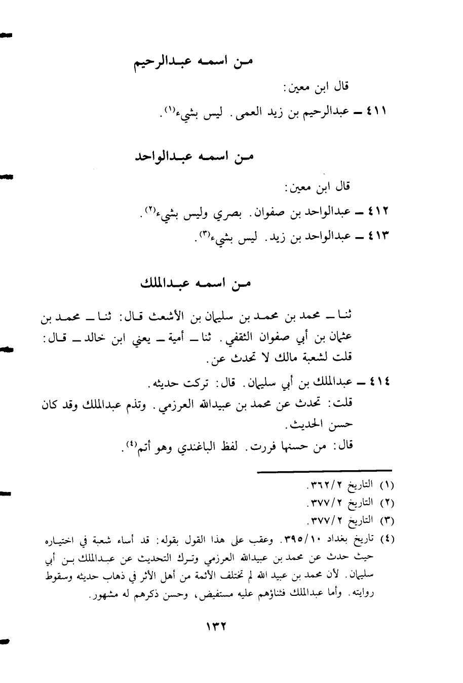 4 تاريخ بغداد 10/395. وعقب علي هذا القول بقوله: قد أساء شعبة في اختياره حيث حدث عن محمد بن عبيد الله العرزمي وترك الحديث عن عبد الملك بن أبي سليمان. لأن محمد بن عبيد الله لم تختلف الأئمة من أهل الأثر في ذهاب حديثه وسقوط روايته. وأما عبد الملك فثناؤهم عله مستفيض, وحسن ذكرهم له مشهور.