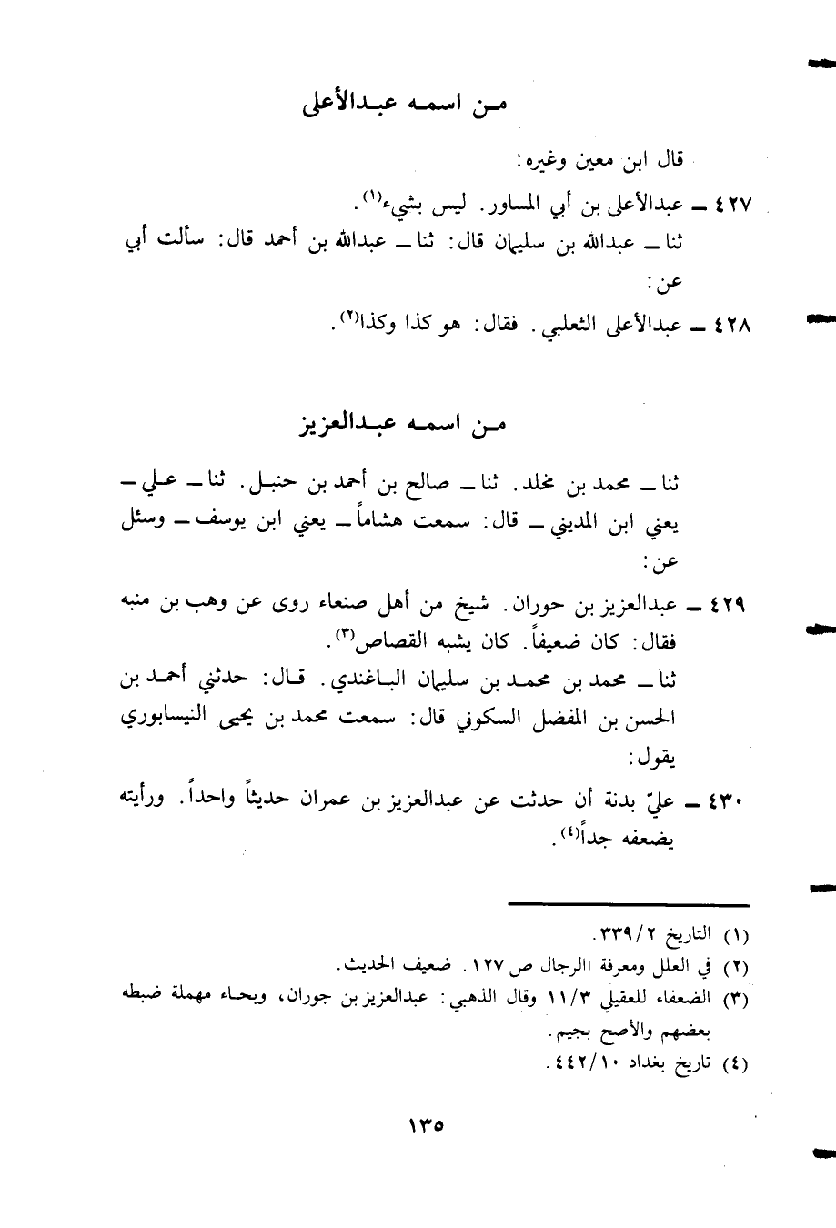 430- علي بدنة أن حدثت عن عبد العزيز بن عمران حديثاً واحداً. ورأيته يضعفه جداً4.