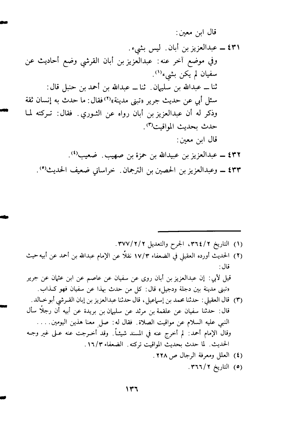 3 قال العقيلي: حدثنا محمد بن إسماعيل, قال حدثنا بن عبد العزيز بن أبان القرشي أبو خالد. قال: حدثنا سفيان عن علقمة بن مرثد عن سليمان بن بريدة عن أبيه أن رجلا سأل النبي عليه السلام عن مواقيت الصلاة. فقال له: صل معنا هاذين اليومين.... وقال الإمام أحمد: لم أخرج عنه في المسند شيئاً. وقد أخرجت عنه على غير وجه الحديث. لما حدث بحديث المواقيت تركته. الضعفاء 3/16.