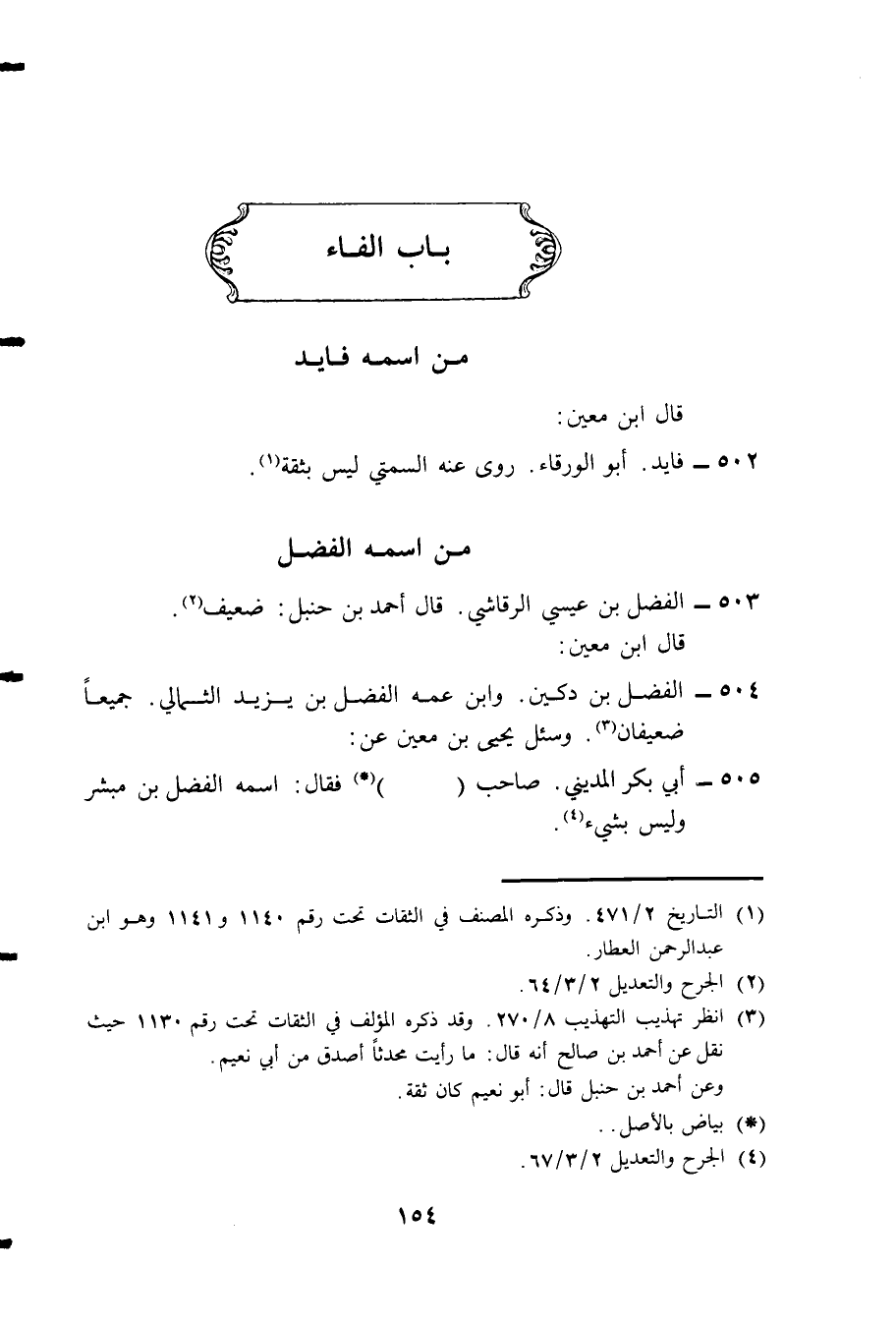 504- الفضل بن دكين. وابن عمه الفضل بن يزيد الثمالي. جميعاً ضعيفان3. وسئل يحيي بن معين عن.