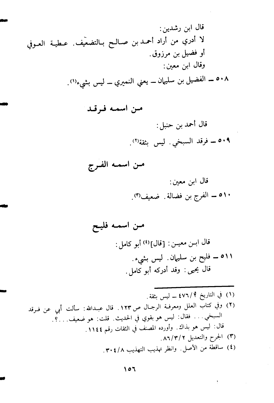 2 وفي كتاب العلل ومعرفة الرجال ص123. قال عبد الله: سألت أبي عن فرقد السبخي ... فقال: ليس هو بقوي في الحديث. قلت: هو ضعيف ... ؟.