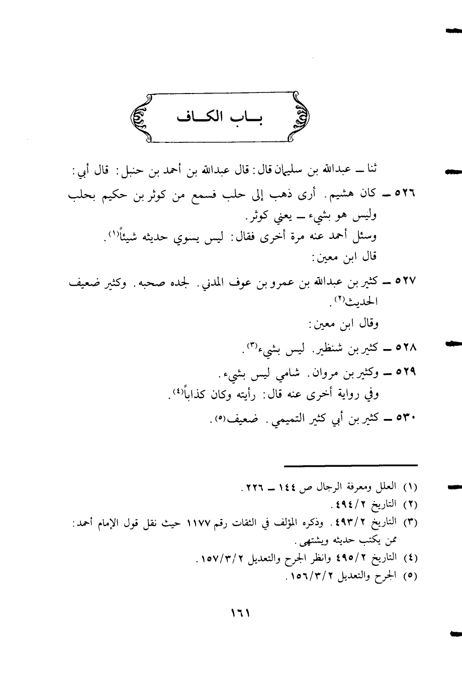 527- كثير بن عبد الله بن عمرو بن عوف المدني. لجده صحبه. وكثير ضعيف الحديث2.