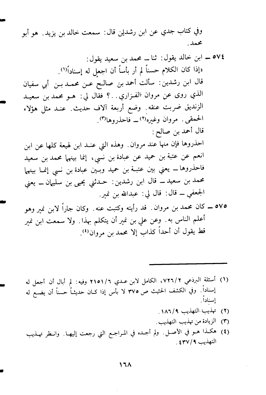 575- كان محمد بن مروان. قد رايته وكتبت عنه. وكان جاراً لابن نمير وهو أعلم الناس به. وعن علي بن نمير أن يتكلم بهذا. ولا سمعت ابن نمير قط يقول أن أحدا كذاب إلا محمد بن مروان4.