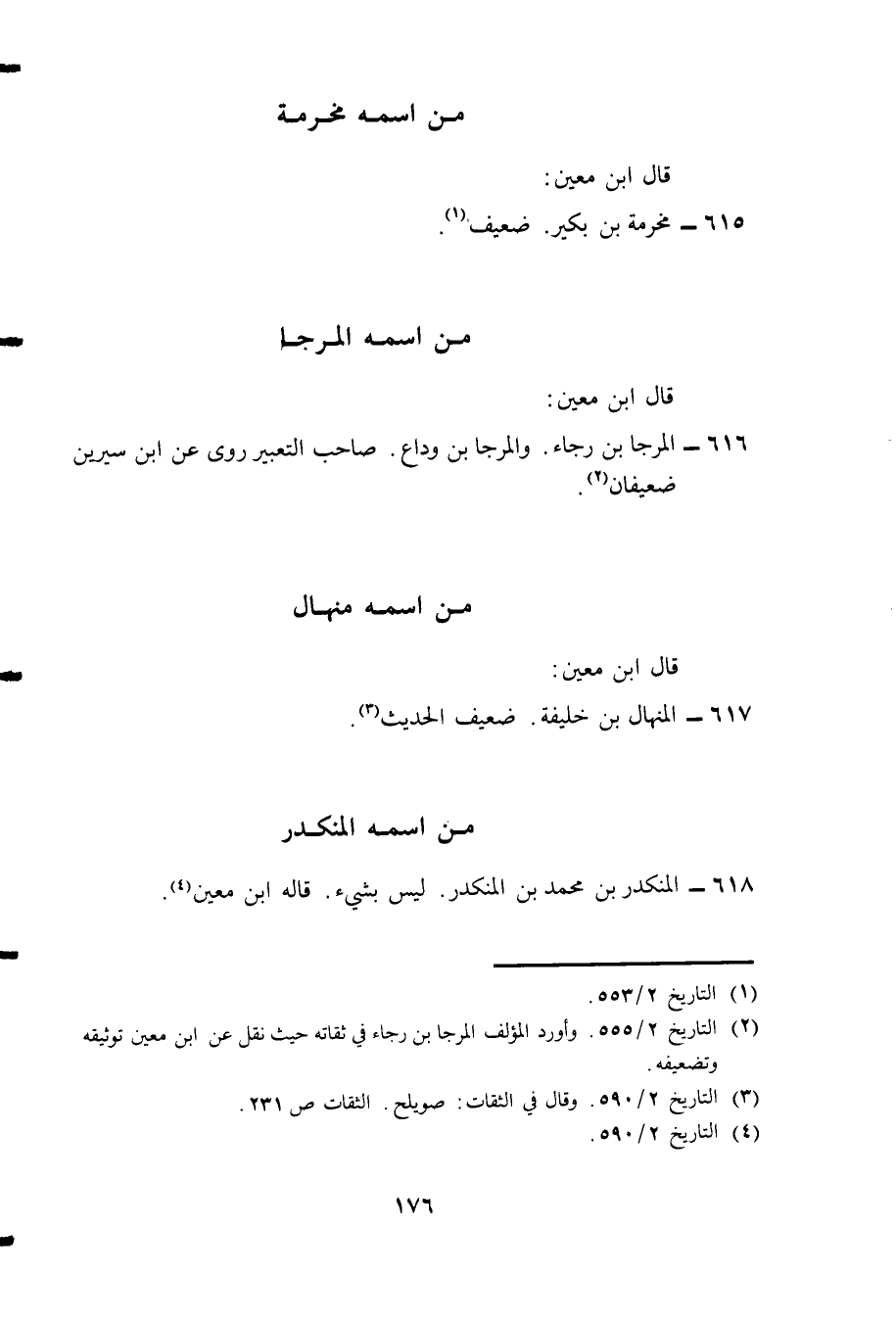 616- المرجا بن رجاء. والمرجا بن وداع. صاحب التعبير روى عن ابن سيرين ضعيفان2.
