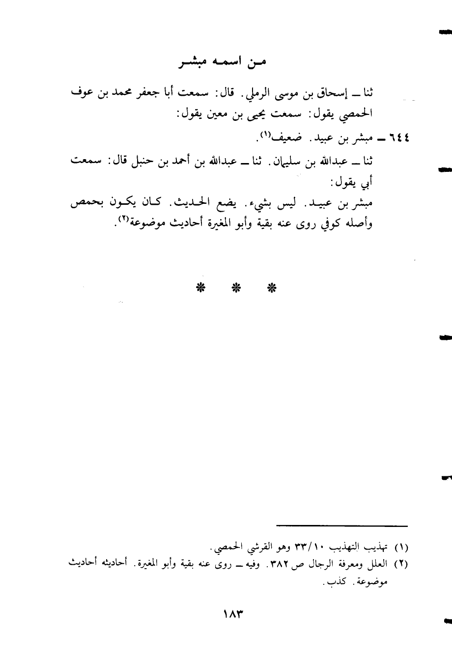 2 العلل ومعرفة الرجال ص382. وفيه – روى عنه بقية وأبو المغيرة. أحاديثه أحاديث موضوعة. كذب.