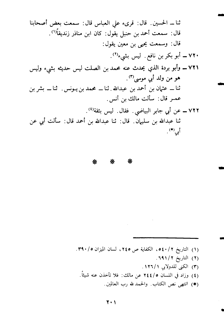 ثنا- الحسين. قال: قرئ على العباس قال: سمعت بعض أصحابنا قال: سمعت أحمد بن حنبل يقول: كان ابن مناذر زنديقاً1.