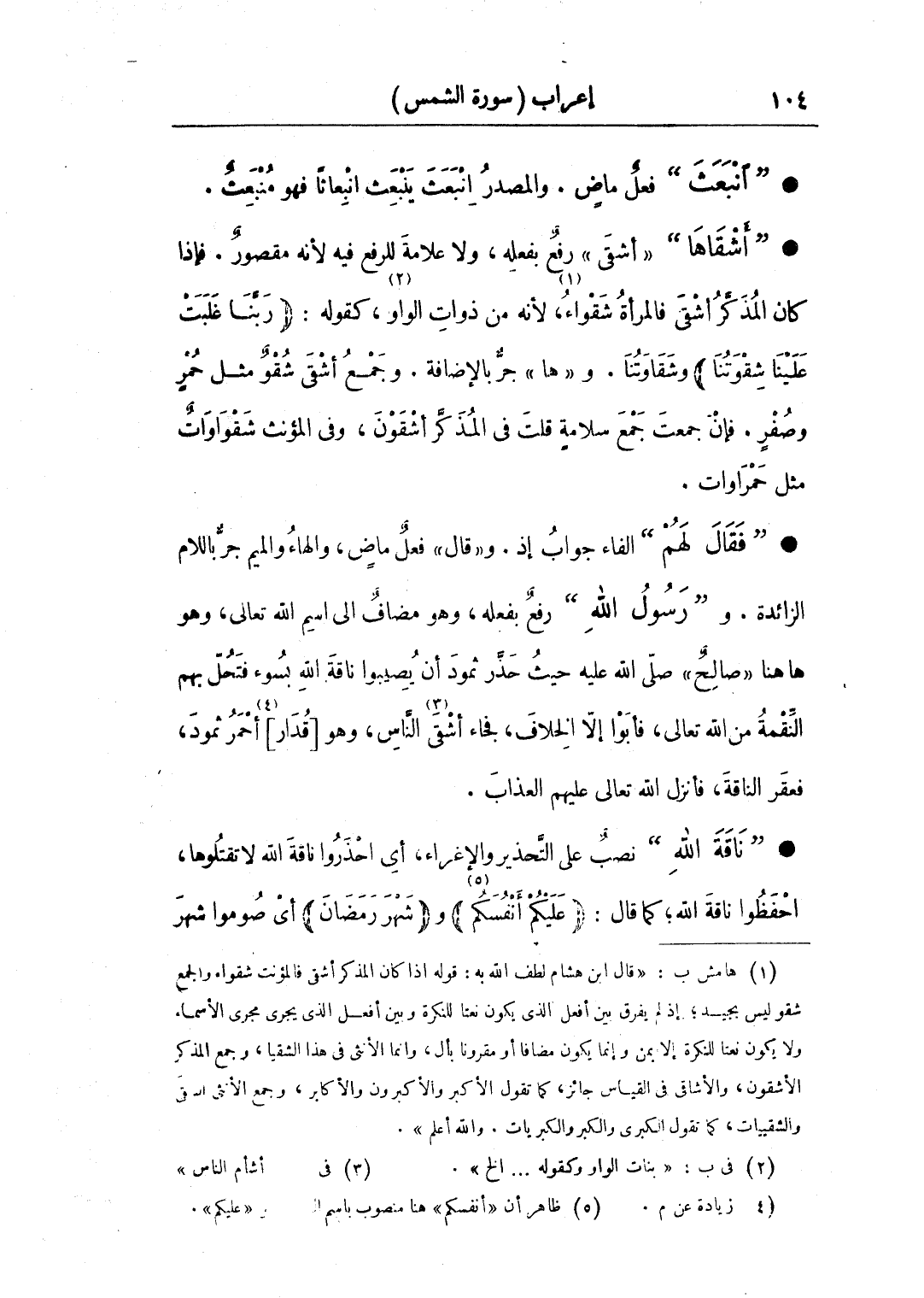 • "أشقاها" «أشقى» رفع بفعله، ولا علامة للرفع فيه لأنه مقصور. فإذا كان المذكر أشقى فالمرأة شقواء، لأنه من ذوات الواو، كقوله: (ربنا غلبت علينا شقوتنا) وشقاوتنا. و «ها» جر بالإضافة. وجمع أشقى شقو مثل حمر وصفر. فإن جمعت جمع سلامة قلت في المذكر أشقون، وفي المؤنث شقواوات مثل حمراوات.