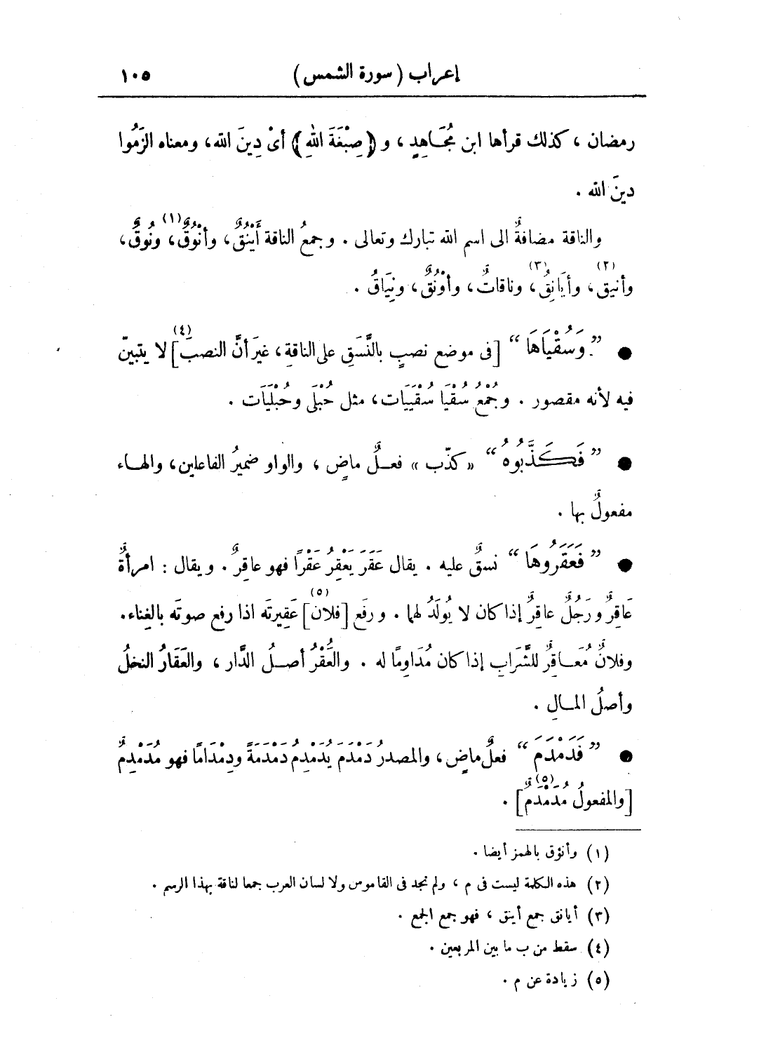 • "فعقروها" نسق عليه. يقال عقر يعقر عقرًا فهو عاقر. ويقال: امرأة عاقر ورجل عاقر إذا كان لا يولد لهما. ورفع [فلان] عقيرته إذا رفع صوته بالغناء. وفلان معاقر للشراب إذا كان مداوما له. والعقر أصل الدار، والعقار النخل وأصل المال.