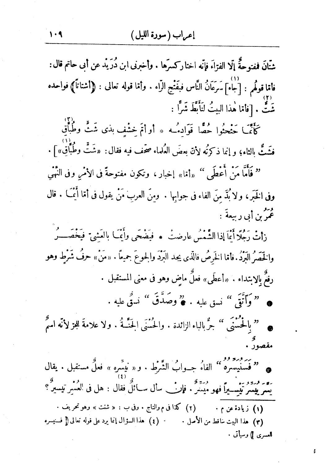 • "فأما من أعطى" «أما» إخبار، وتكون مفتوحة في الأمر وفي النهي وفي الخبر، ولا بد من الفاء في جوابها. ومن العرب من يقول في أما أيما، قال عمر بن أبي ربيعة: