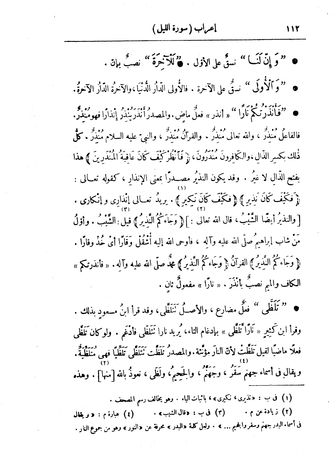 • "فأنذرتكم نارًا" «أنذر» فعل ماض. والمصدر أنذر ينذر إنذارًا فهو منذرٌ. فالفاعل منذر، والله تعالى منذر، والقرآن منذر، والنبي عليه السلام منذر، كل ذلك بكسر الذال، والكافرون منذرون، (فانظر كيف عاقبة المنذرين) هذا بفتح الذال لا غير. وقد يكون النذير مصدرًا بمعنى الإنذار، كقوله تعالى: (فكيف كان نذير) (فكيف كان نكير). يريد تعالى إنذاري وإنكاري. [والنذير أيضًا الشيب، قال الله تعالى:] (وجاءكم النذير) قيل: الشيب. وأول من شاب إبراهيم صلى الله عليه وآله، فأوحى الله إليه أُشْقُل وقارًا أي خذ وقارًا. (وجاءكم النذير) القرآن (وجاءكم النذير) محمد صلى الله عليه وآله، (فأنذرتكم) الكاف والميم نصب بأنذر. «نارًا» مفعولٌ ثان.
