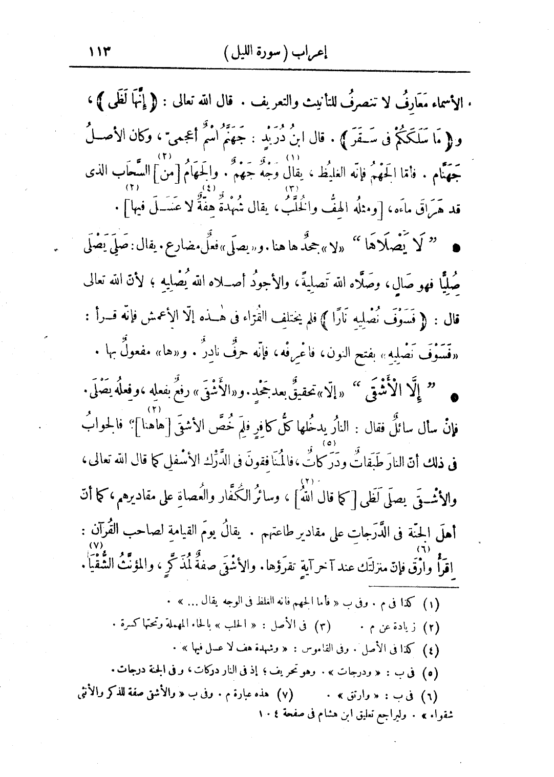 • "إلا الأشقى" «إلا» تحقيق بعد جحد. و «الأشقى» رفع بفعله، وفعله يصلى. فإن سأل سائل فقال: النار يدخلها كل كافر فلم خص الأشقى [ها هنا]؟ فالجواب في ذلك أن النار طبقات ودركات، فالمنافقون في الدرك الأسفل كما قال الله تعالى، والأشقى يصلى لظى [كما قال الله]، وسائر الكفار والعصاة على مقاديرهم، كما أن أهل الجنة في الدرجات على مقادير طاعتهم. يقال يوم القيامة لصاحب القرآن: اقرأ وارق فإن منزلتك عند آخر آية تقرؤها. والأشقى صفة لمذكرٍ، والمؤنث الشقيا.