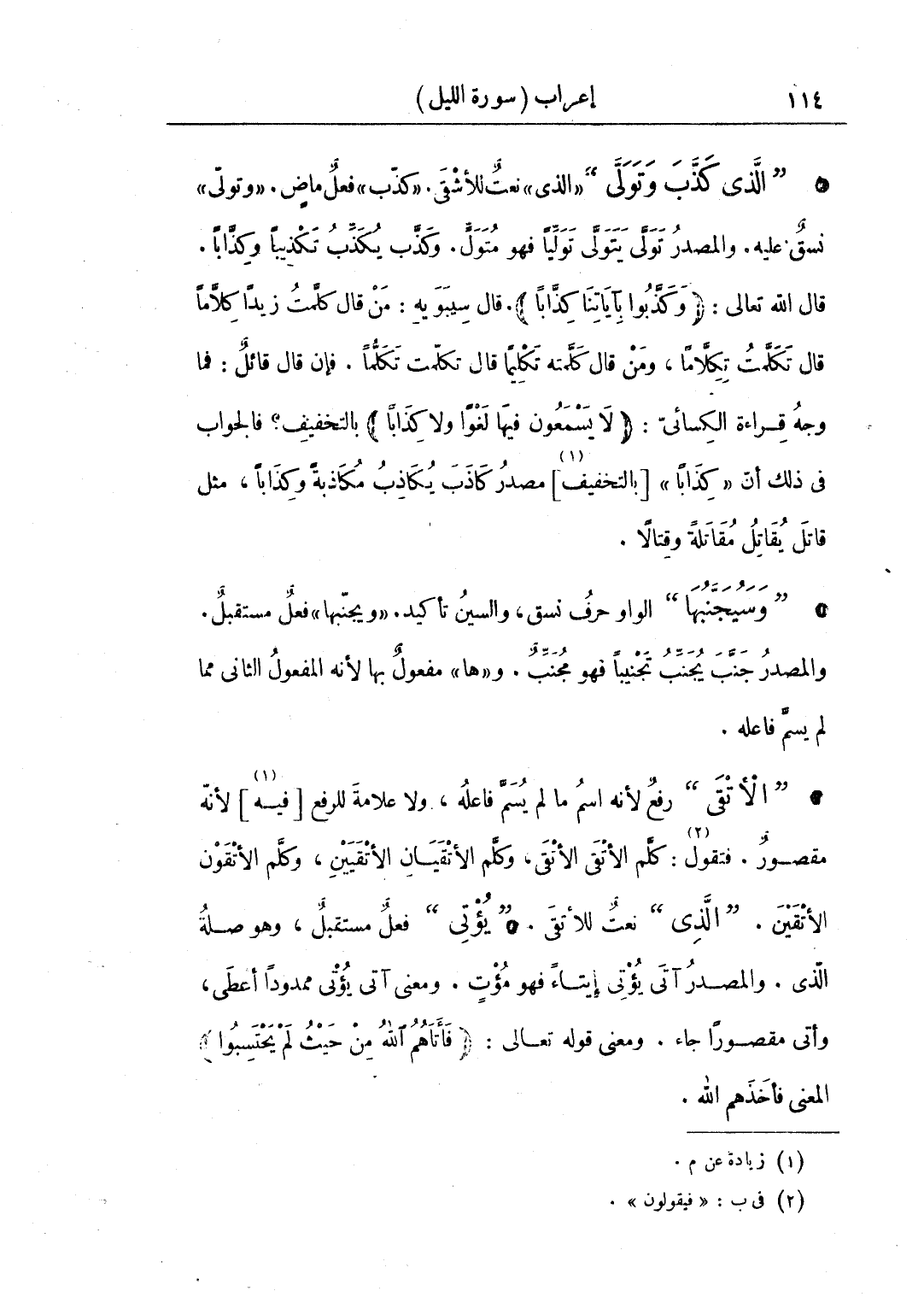 • "الذي كذب وتولى" «الذي» نعت للأشقى. «كذب» فعل ماض. «وتولى» نسق عليه. والمصدر تولى يتولى توليا فهو متول. وكذب يكذب تكذيبا وكِذابا. قال الله تعالى: (وكذبوا بآياتنا كذابا). قال سيبويه: من قال كلمتُ زيدًا كلامًا قال تكلمتُ تكلاما، ومن قال كلمته تكليما قال تكلمت تكلمًا. فإن قال قائلٌ: فما وجه قراءة الكسائي: (لا يسمعون فيها لغوًا ولا كِذَابًا) بالتخفيف؟ فالجواب في ذلك أن «كذابا» [بالتخفيف] مصدر كاذب يكاذب مكاذبة وكذابًا، مثل قاتل يقاتل مقاتلة وقتالا.