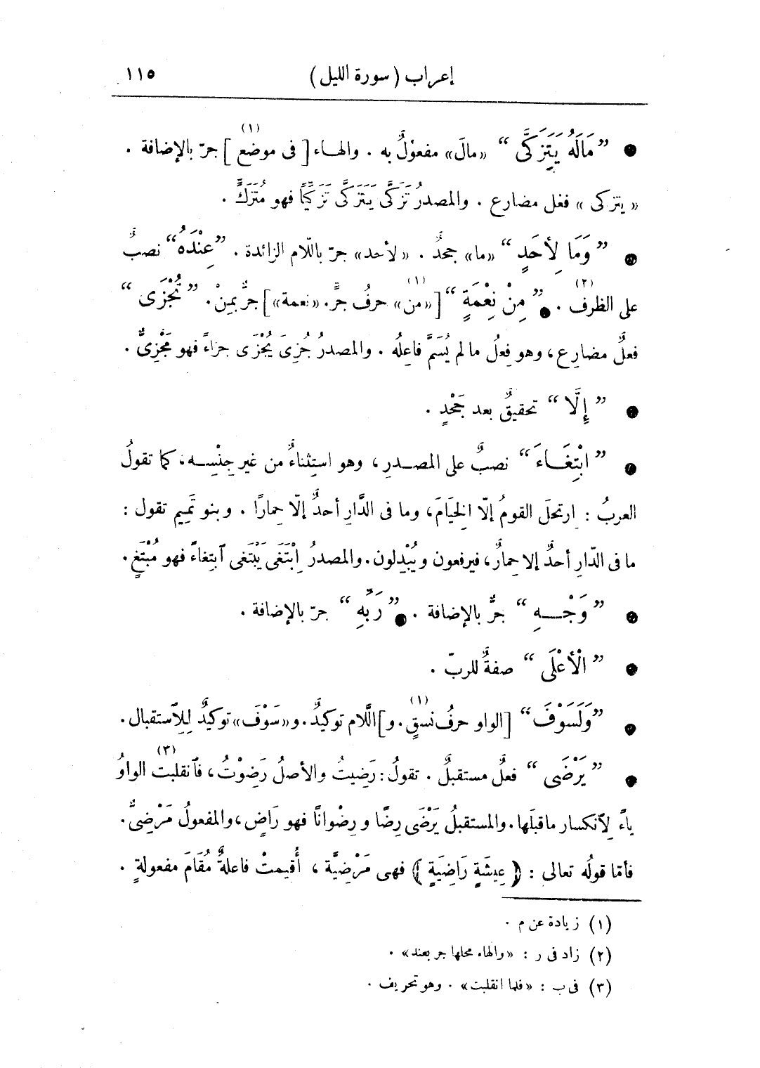 • "ماله يتزكى" «مال» مفعول به. والهاء [في موضع] جر بالإضافة. «يتزكى» فعل مضارع. والمصدر تزكى يتزكى تزكيا فهو متزك.