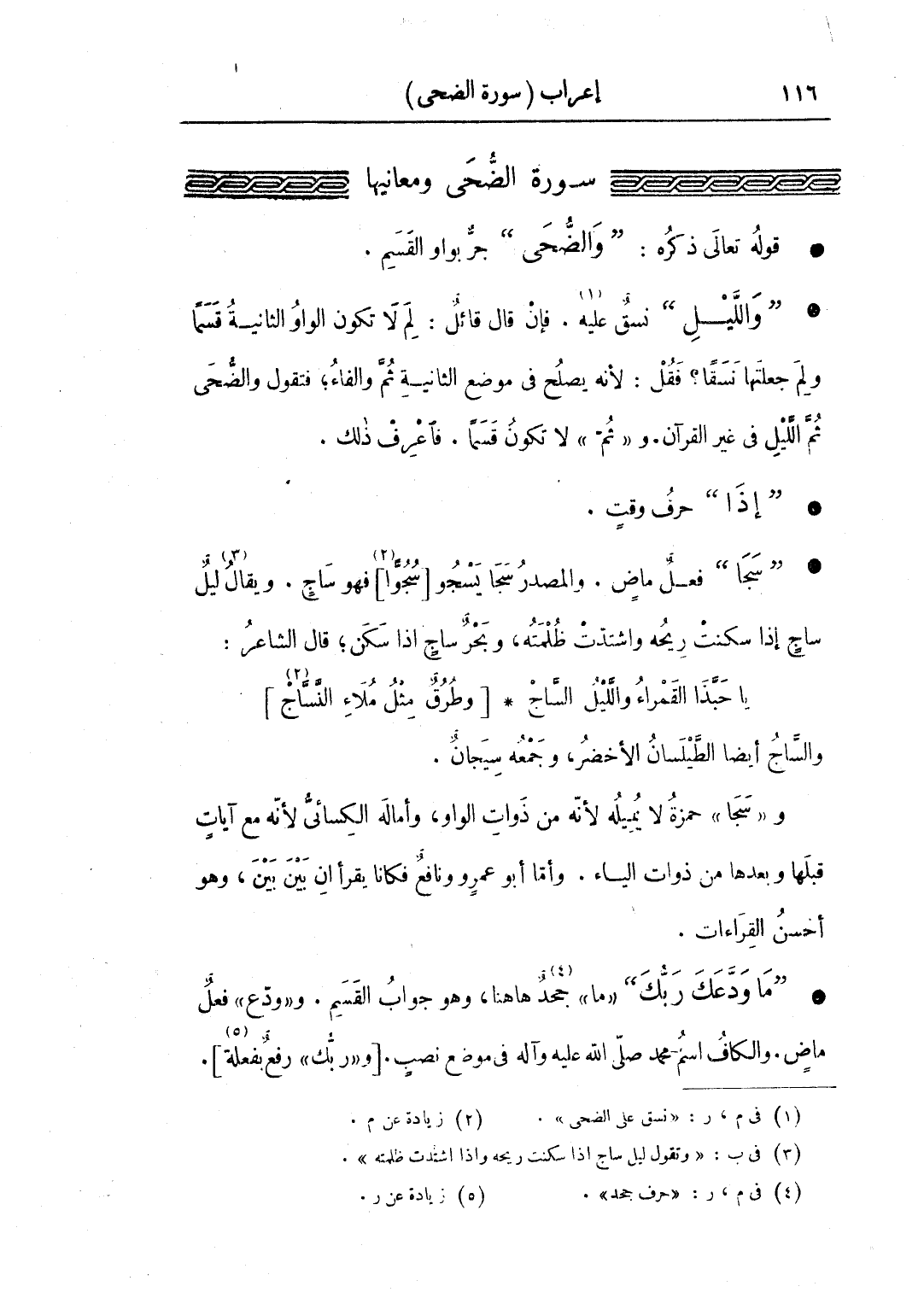 • "ما ودعك ربك" «ما» جحد ها هنا، وهو جواب القسم. و «دع» فعلٌ ماض. والكاف اسم محمد صلى الله عليه وآله في موضع نصب. [«وربك» رفع بفعلة].