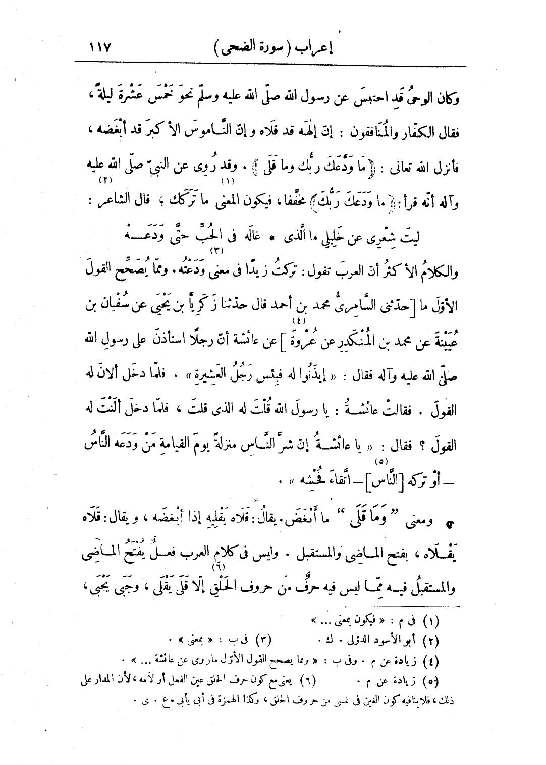 • ومعنى "وما قلى" ما أبغض. يقال: قلاه يقليه إذا أبغضه، ويقال: قلاه يقلاه، بفتح الماضي والمستقبل. وليس في كلام العرب فعل يفتح الماضي والمستقبل فيه مما ليس فيه حرف من حروف الحلق إلا قلى يقلي، وجبى يجبي،