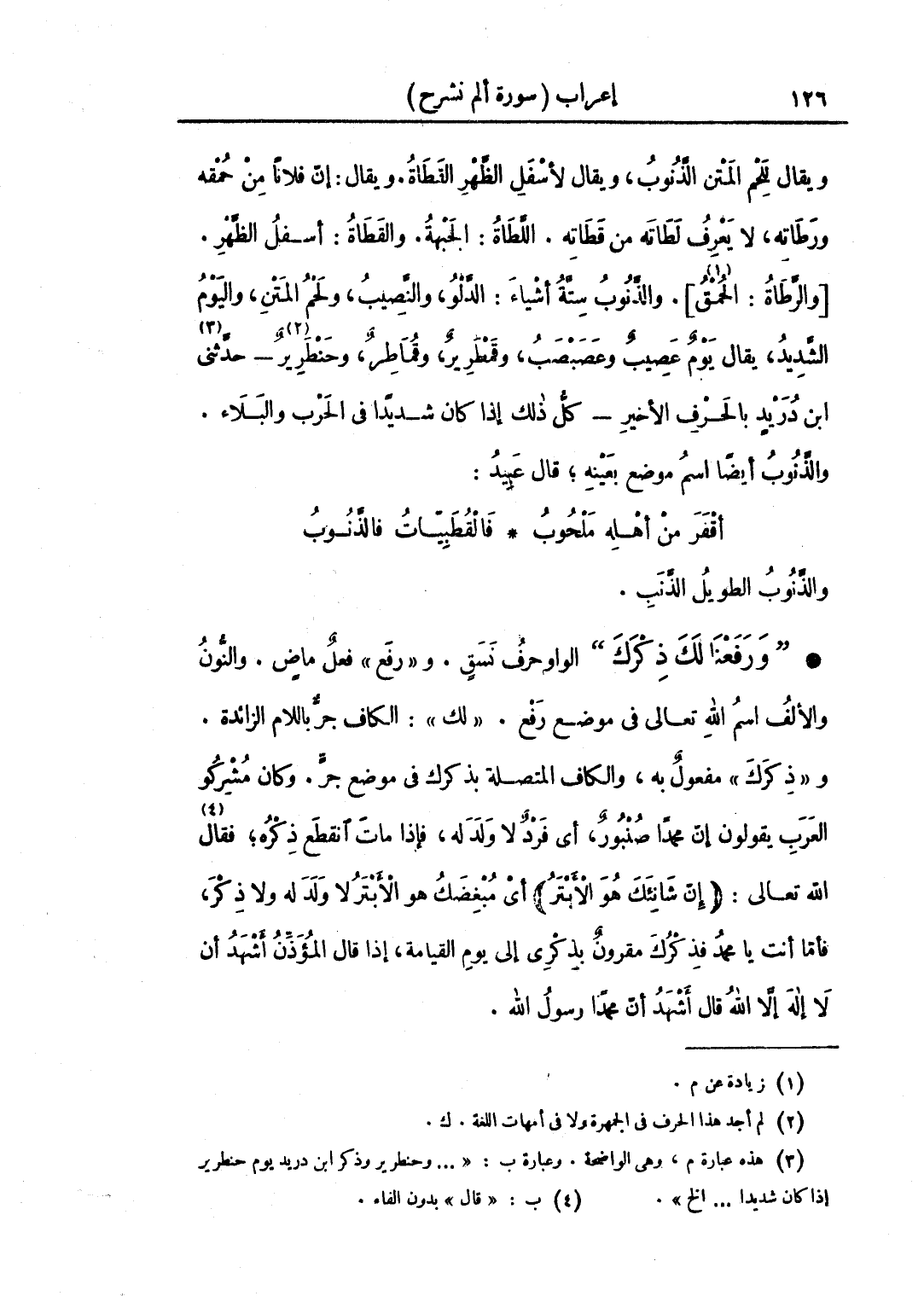 • "ورفعنا لك ذكرك" الواو حرف نسق. و «رفع» فعل ماض. والنون والألف اسم الله تعالى في موضع رفع. «لك»: الكاف جر باللام الزائدة. و «ذكرك» مفعول به، والكاف المتصلة بذكرك في موضع جر. وكان مشركو العرب يقولون إن محمدًا صُنْبُورٌ، أي فردٌ لا ولد له، فإذا مات انقطع ذكره؛ فقال الله تعالى: (إن شانئك هو الأبتر) أي مبغضك هو الأبتر لا ولد له، ولا ذكر، فأما أنت يا محمد فذكرك مقرون بذكري إلى يوم القيامة، إذا قال المؤذن أشهد أن لا إله إلا الله قال أشهد أن محمدًا رسول الله.