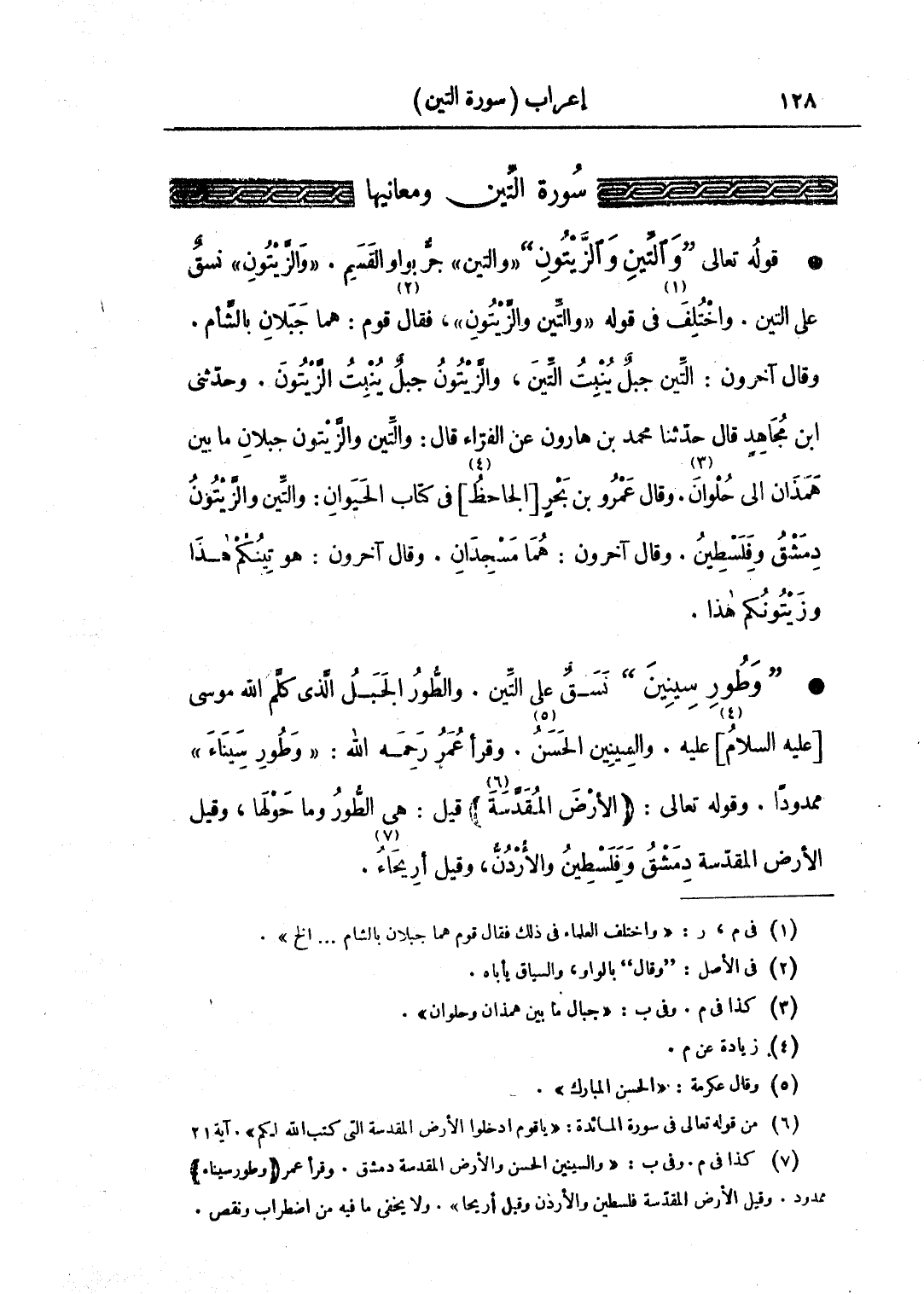 قوله تعالى: •"والتين والزيتون" «والتين» جر بواو القسم. «والزيتون» نسقٌ على التين. واختلف في قوله: «والتين والزيتون» فقال قوم: هما جبلان بالشأم. وقال آخرون: التين جبل ينبت التين، والزيتون جبل ينبت الزيتون. وحدثني ابن مجاهد قال حدثنا محمد بن هارون عن الفراء، قال: والتين والزيتون جبلان ما بين همذان إلى حلون. وقال عمرو بن بحر [الجاحظ] في كتاب الحيوان: والتين والزيتون دمشق وفلسطين. وقال آخرون: هما مسجدان. وقال آخرون هو تينكم هذا وزيتونكم هذا.