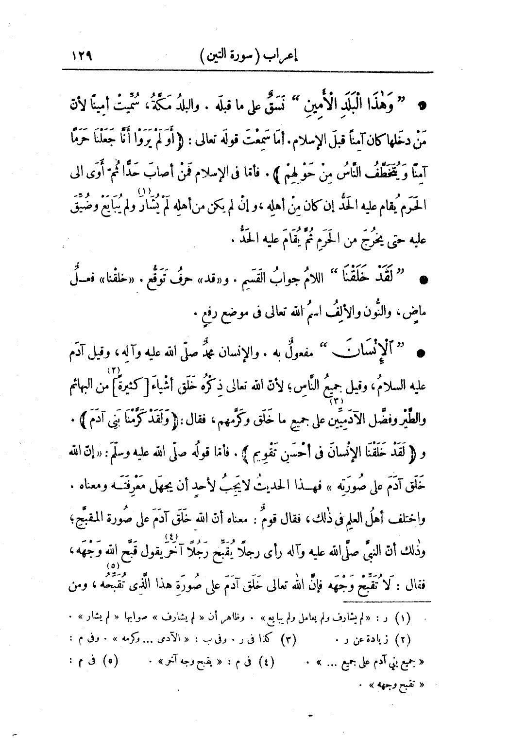 • "وهذا البلد الأمين" نسق على ما قبله. والبلد مكة، سميت أمينًا لأن من دخلها كان آمنا قبل الإسلام. أما سمعت قوله تعالى: (أو لم يروا أنا جعلنا حرما آمنا ويتخطف الناس من حولهم). فأما في الإسلام فمن أصاب حدَّا ثم أوي إلى الحرم يقام عليه الحد إن كان من أهله، وإن لم يكن من أهله لم يشار ولم يبايع وضيق عليه حتى يخرج من الحرم ثم يقام عليه الحد.