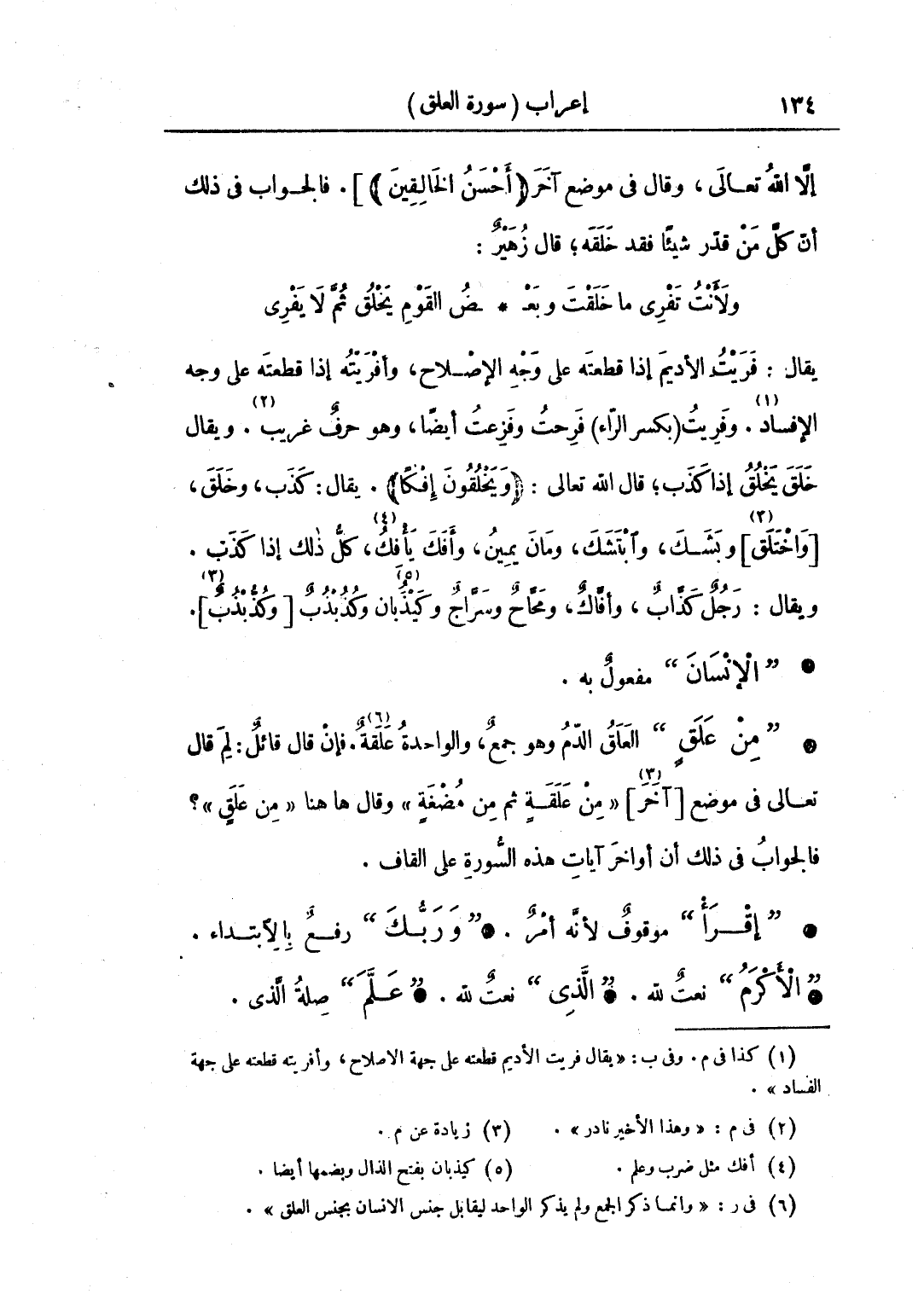 • "من علق" العلق الدم وهو جمع، والواحدة علقة. فإن قال قائل: لم قال تعالى في موضع [آخر] «من علقة ثم مضغة» وقال ها هنا «من علق»؟ فالجواب في ذلك أن أواخر آيات هذه السورة على القاف.