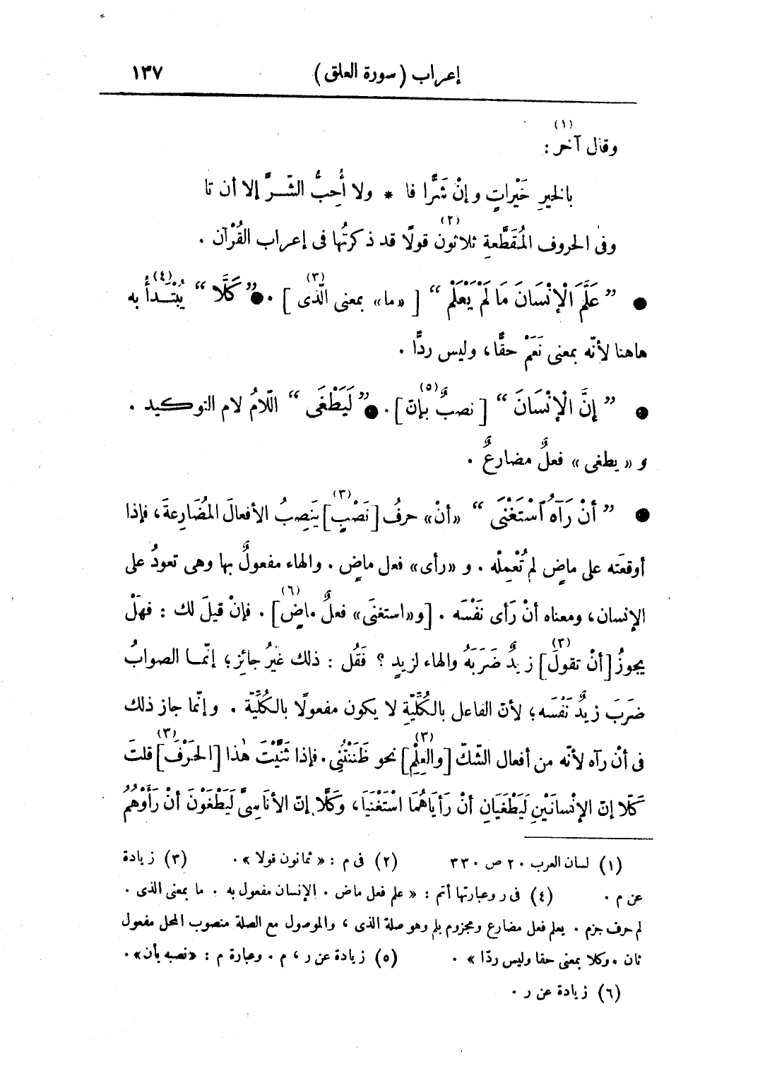 • "أن رآه استغنى" «أن» حرف [نصب] ينصب الأفعال المضارعة، فإذا أوقعته على ماض لم تعمله. و «رأى» فعل ماض. والهاء مفعولٌ بها وهي تعود على الإنسان، ومعناه أن رأى نفسه. [و «استغنى» فعل ماض]. فإن قيل لك: فهل يجوز [أن تقول] زيدٌ ضربه والهاء لزيد؟ فقل: ذلك غير جائز؛ إنما الصواب ضرب زيد نفسه؛ لأن الفاعل بالكلية لا يكون مفعولاً بالكلية. وإنما جاز ذلك في أن رآه لأنه من أفعال الشك [والعلم] نحو ظننتني. فإذا ثنيت هذا [الحرف] قلت كلا إن الإنسانين ليطغيان أن رأياهما استغنيا، وكلا إن الأناسي ليطغون أن رأوهم
