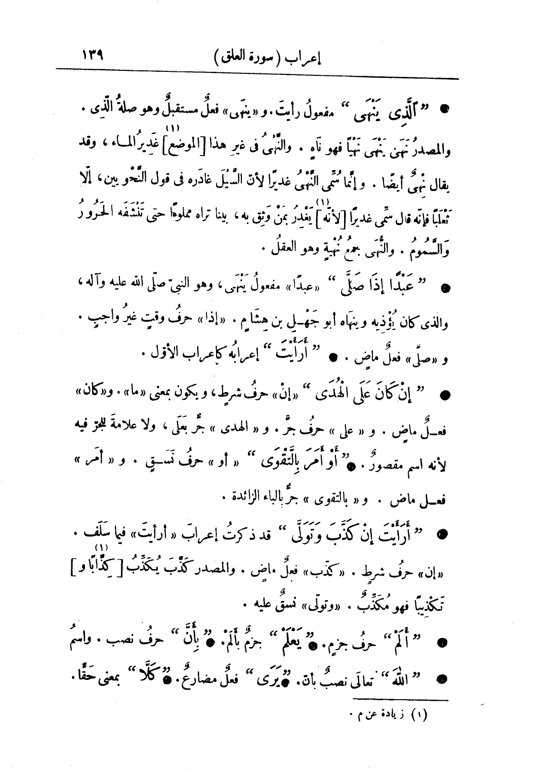 • "عبدا إذا صلى" «عبدًا» مفعول ينهى، وهو النبي صلى الله عليه وآله، والذي كان يؤذيه وينهاه أبو جهل بن هشام. و «إذا» حرف وقت غير واجب. و «صلى» فعل ماض. "أرأيت" إعرابه كإعراب الأول.