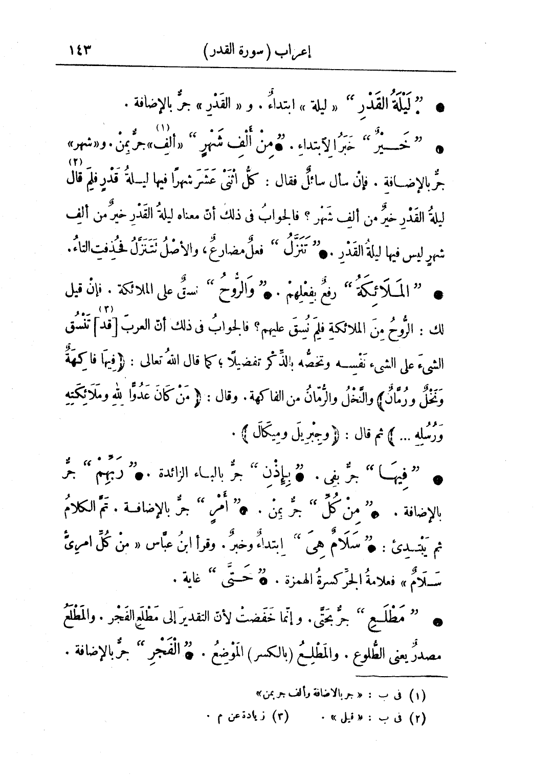 • "خير" خبر الابتداء. "من ألف شهر" «ألف» جر بمن. و «شهر» جر بالإضافة. فإن سأل سائلٌ فقال: كل اثنى عشر شهرا فيها ليلة قدر فلم قال ليلة القدر خير من ألف شهر؟ فالجواب في ذلك أن معناه ليلة القدر خير من ألف شهر ليس فيها ليلة القدر.