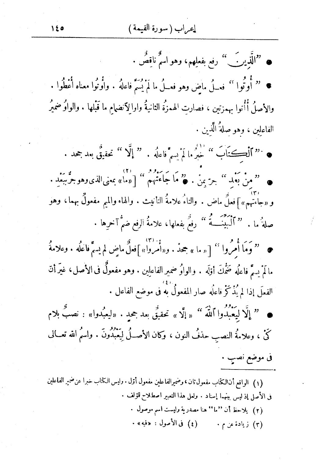 • "إلا ليعبدوا الله" «إلا» تحقيق بعد جحد. «ليعبدوا»: نصب بلام كي، وعلامة النصب حذف النون، وكان الأصل ليعبدون. واسم الله تعالى في موضع نصب.