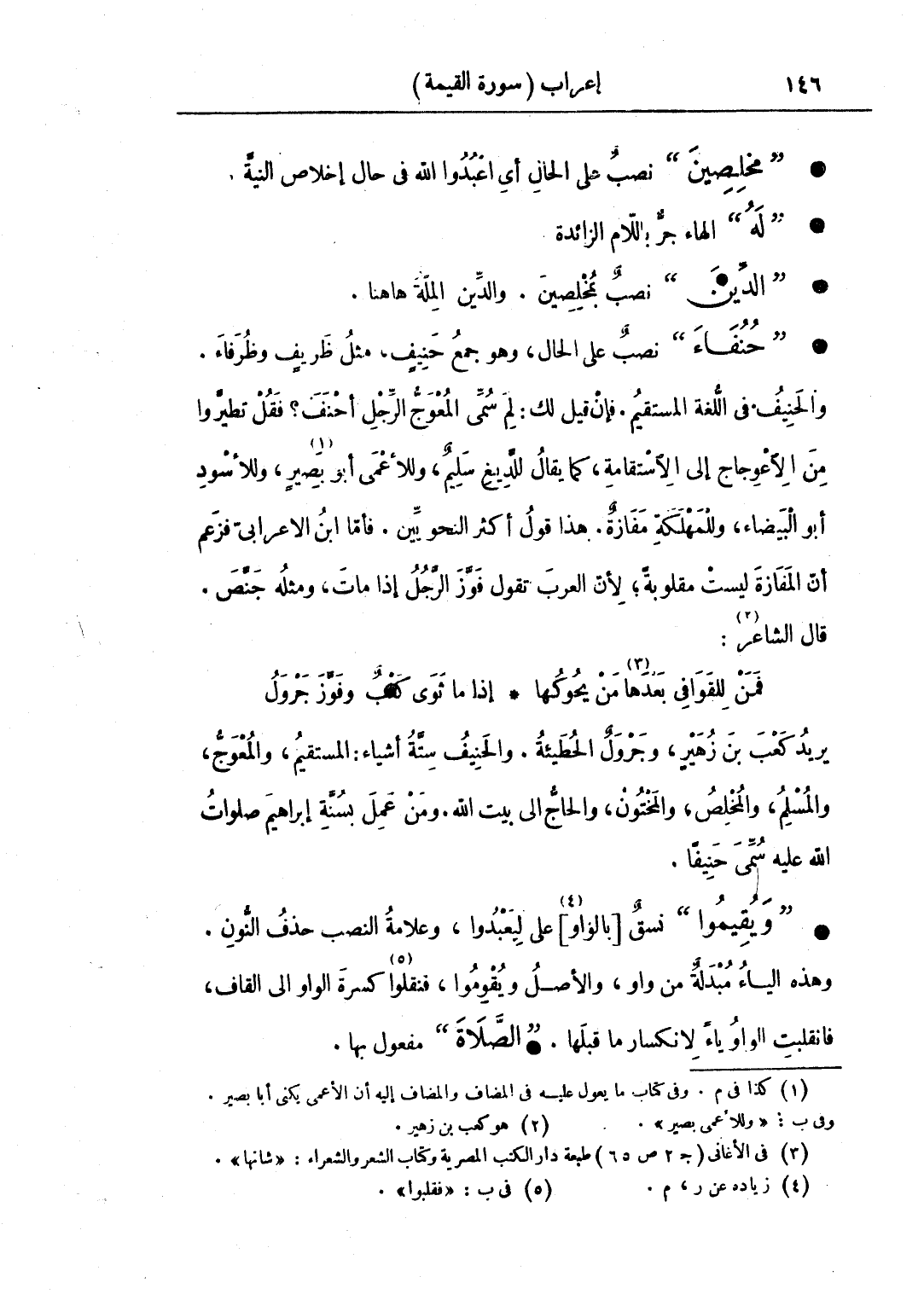 • "ويقيموا" نسق [بالواو] على ليعبدوا، وعلامة النصب حذف النون. وهذه الياء مبدلة من واو، والأصل ويقوموا، فنقلوا كسرة الواو إلى القاف، فانقلبت الواو ياء لانكسار ما قبلها. "الصلاة" مفعول بها.