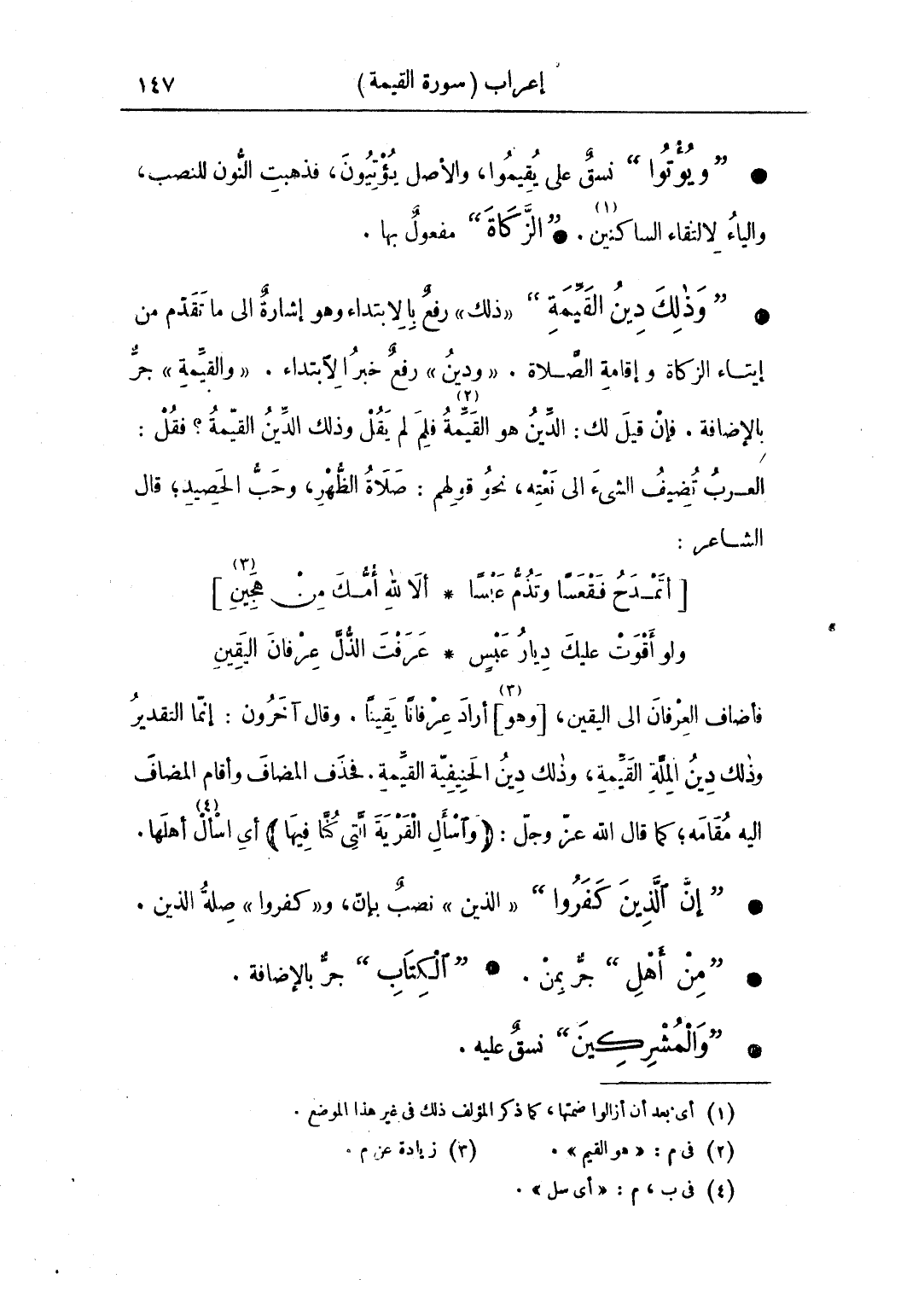 • "وذلك دين القيمة" «ذلك» رفع بالابتداء، وهو إشارة إلى ما تقدم من إيتاء الزكاة وإقامة الصلاة. «ودين» رفع خبر الابتداء. «والقيمة» جر بالإضافة. فإن قيل لك: الدين هو القيمة فلم لم يقل وذلك الدين القيمة؟ فقل: العرب تضيف الشيء إلى نعته، نحو قولهم: صلاة الظهر، وحب الحصيد؛ قال الشاعر: